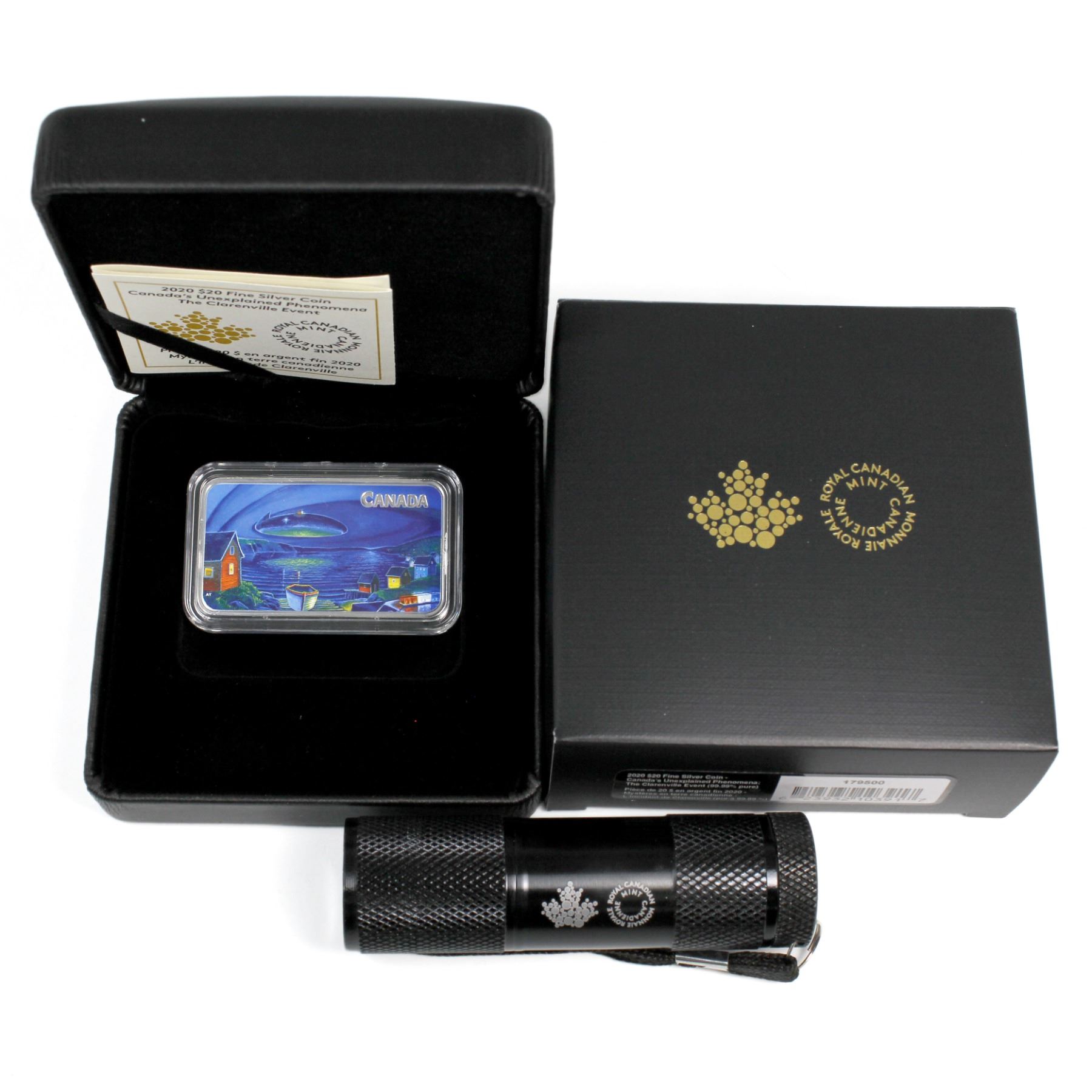 2020 $20 Canada's Unexplained Phenomena - The Clarenville Event Fine Silver Rectangular Coin with Black Light for Glow in the Dark Effect. (TAX Exempt)