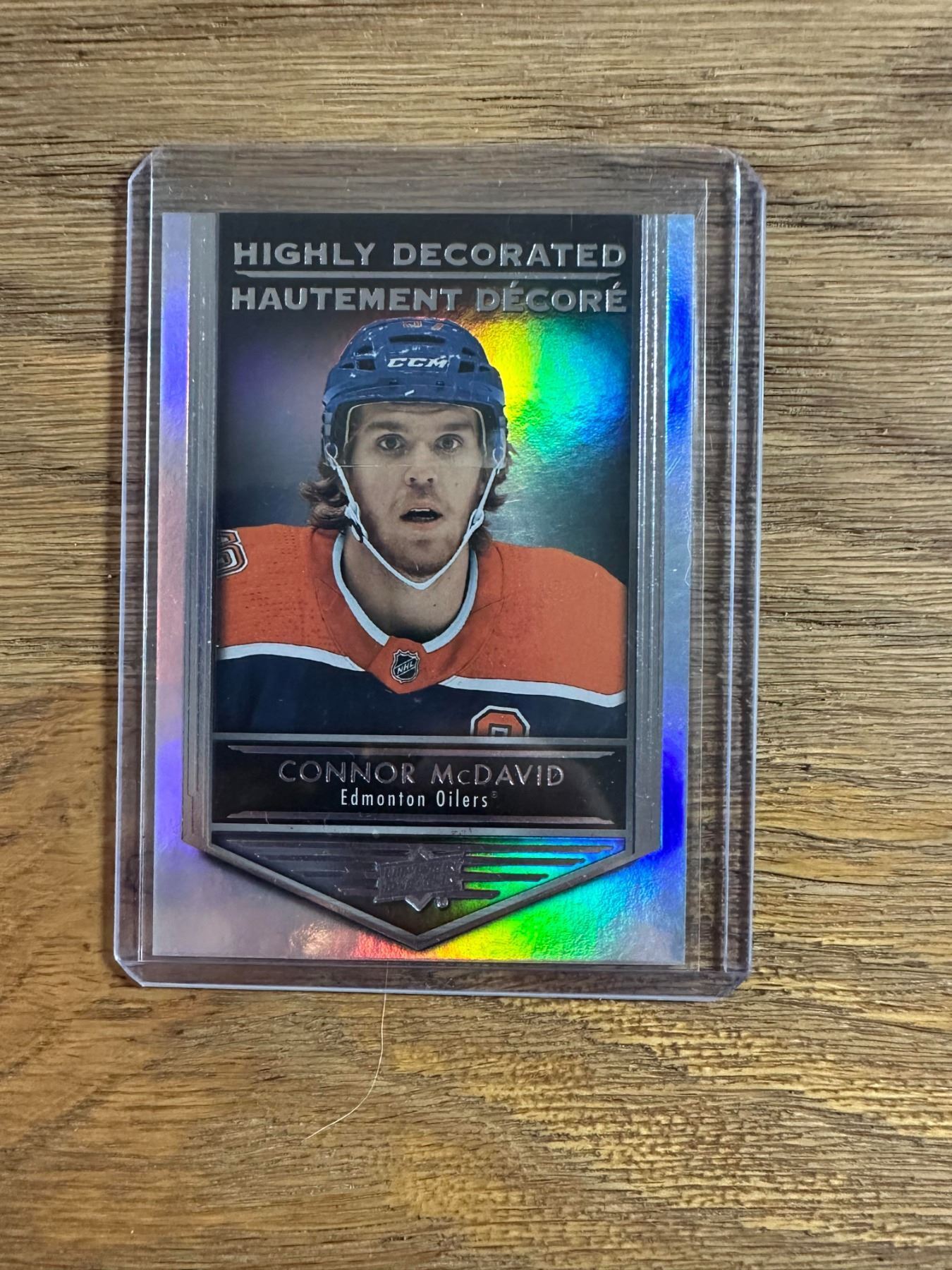 Three-card lot featuring Connor McDavid from multiple premium issues. Includes Highly Decorated and Game Day Action inserts from the 2019–20 Tim Hortons Collector’s Series, plus 2021–22 OPC base card (#314). Sharp surfaces, centered, - Hockey Card