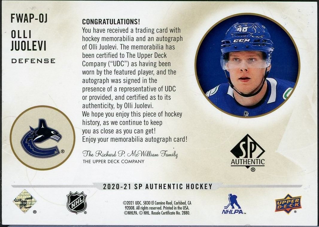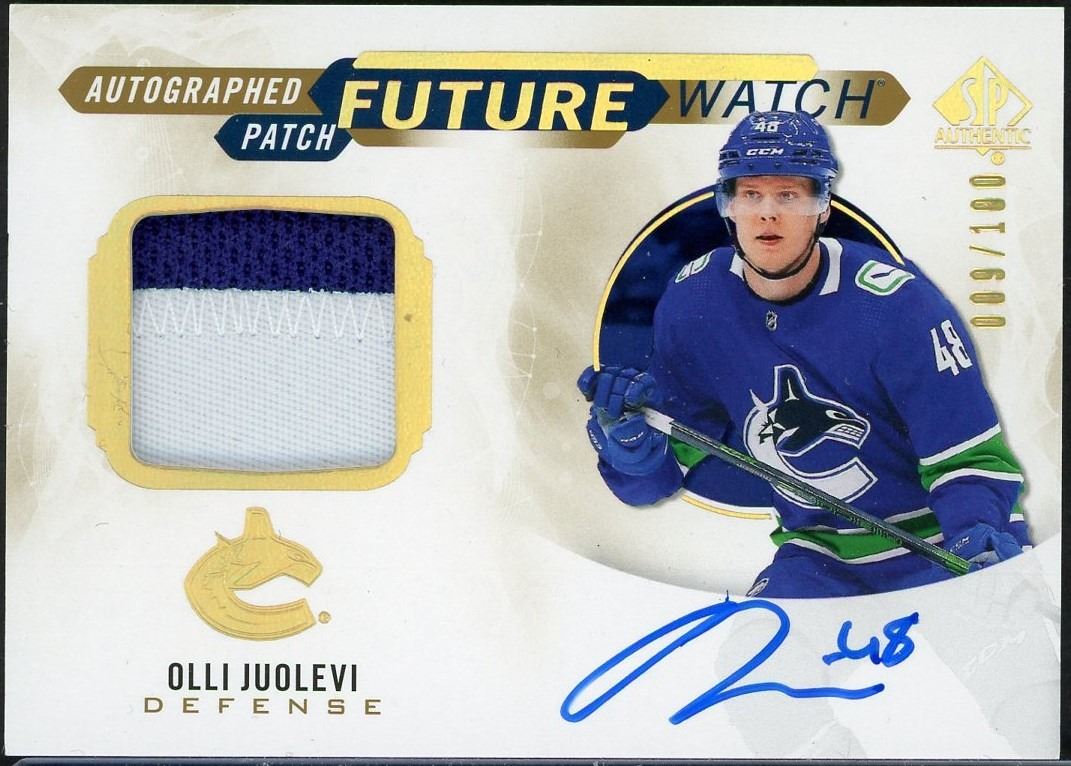 2020-21 SP Authentic future watch auto patch of former 1st round pick Olli Juolevi #'d to 100