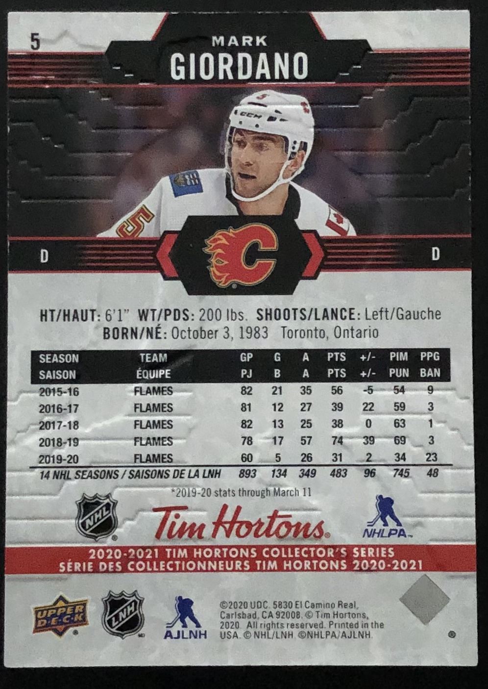 Tim Hortons card #5 hockey, NHL, UD, regional