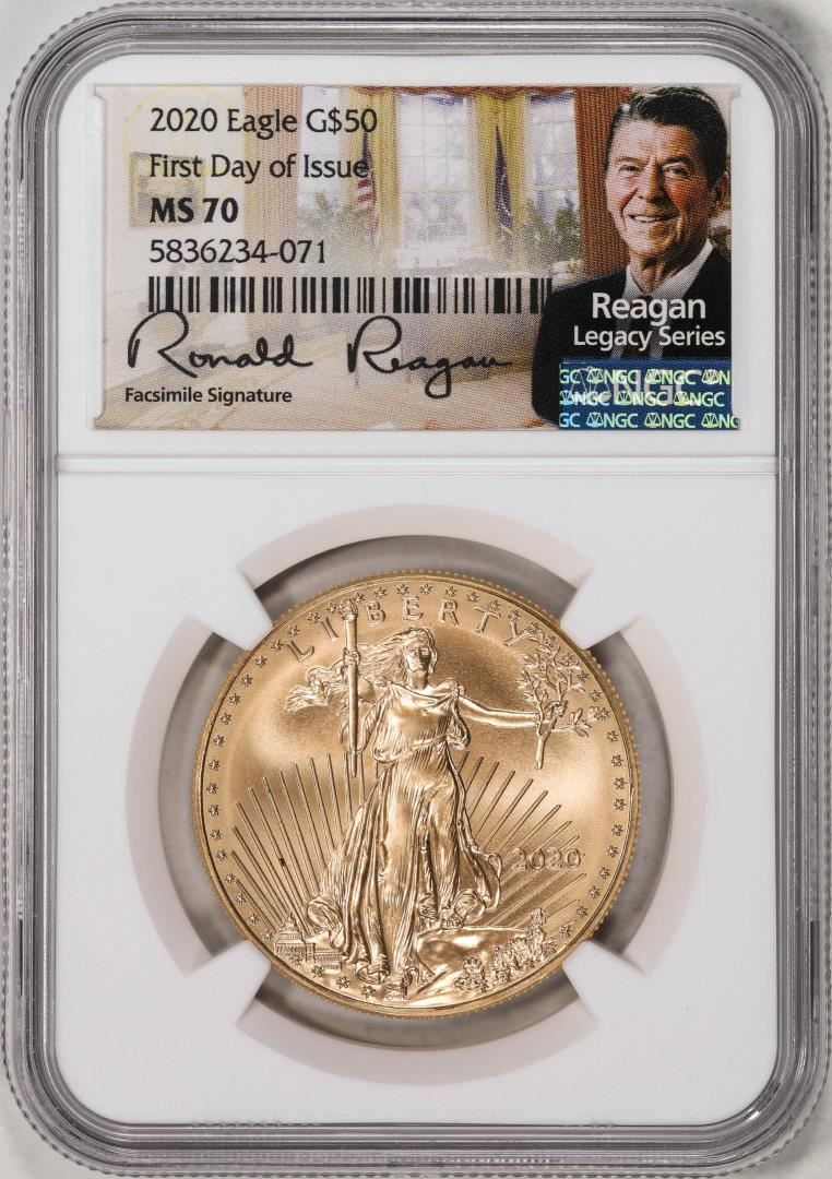 One 2020 $50 American Gold Eagle Coin NGC MS70 FDOI Reagan Legacy Series Signature. NGC Certified.