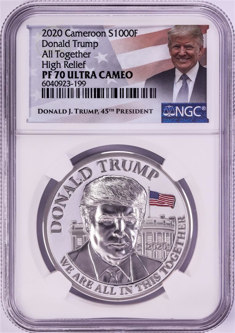 One 2020 Cameroon 1000 Francs High Relief Donald Trump Silver Coin NGC PF70 Ultra Cameo.