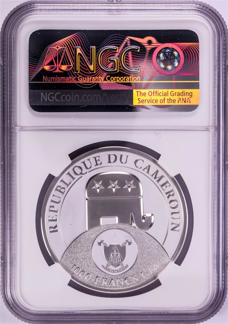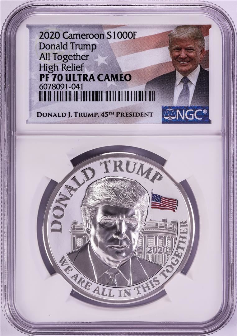 One 2020 Cameroon 1000 Francs High Relief Donald Trump Silver Coin NGC PF70 Ultra Cameo. NGC Certified.