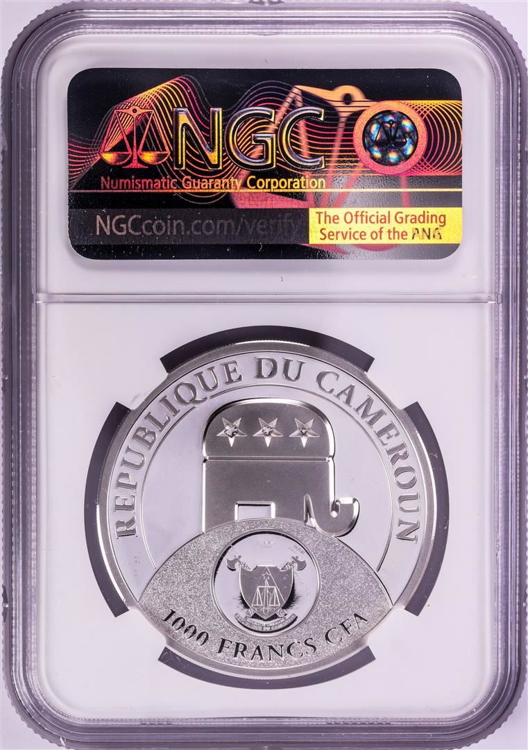 One 2020 Cameroon 1000 Francs High Relief Donald Trump Silver Coin NGC PF70 Ultra Cameo.