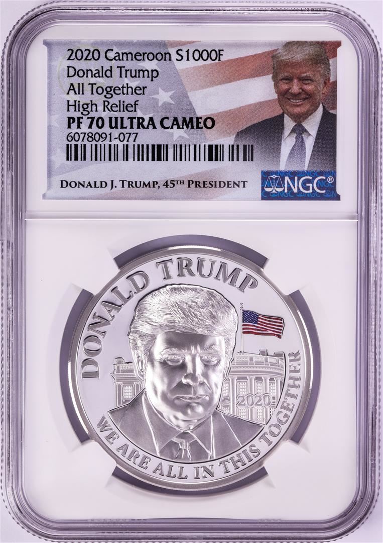 One 2020 Cameroon 1000 Francs High Relief Donald Trump Silver Coin NGC PF70 Ultra Cameo.