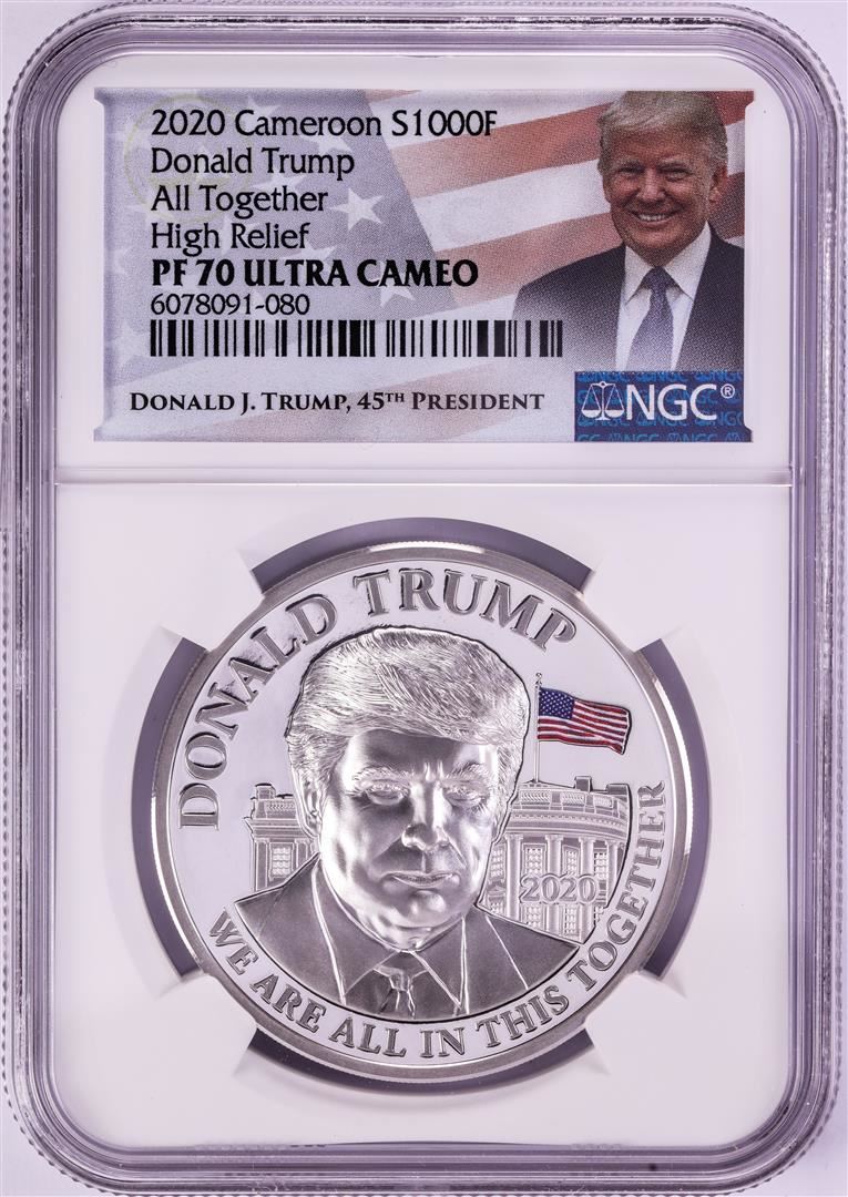 One 2020 Cameroon 1000 Francs High Relief Donald Trump Silver Coin NGC PF70 Ultra Cameo.