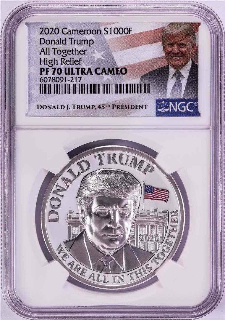 One 2020 Cameroon 1000 Francs High Relief Donald Trump Silver Coin NGC PF70 Ultra Cameo. NGC Certified.