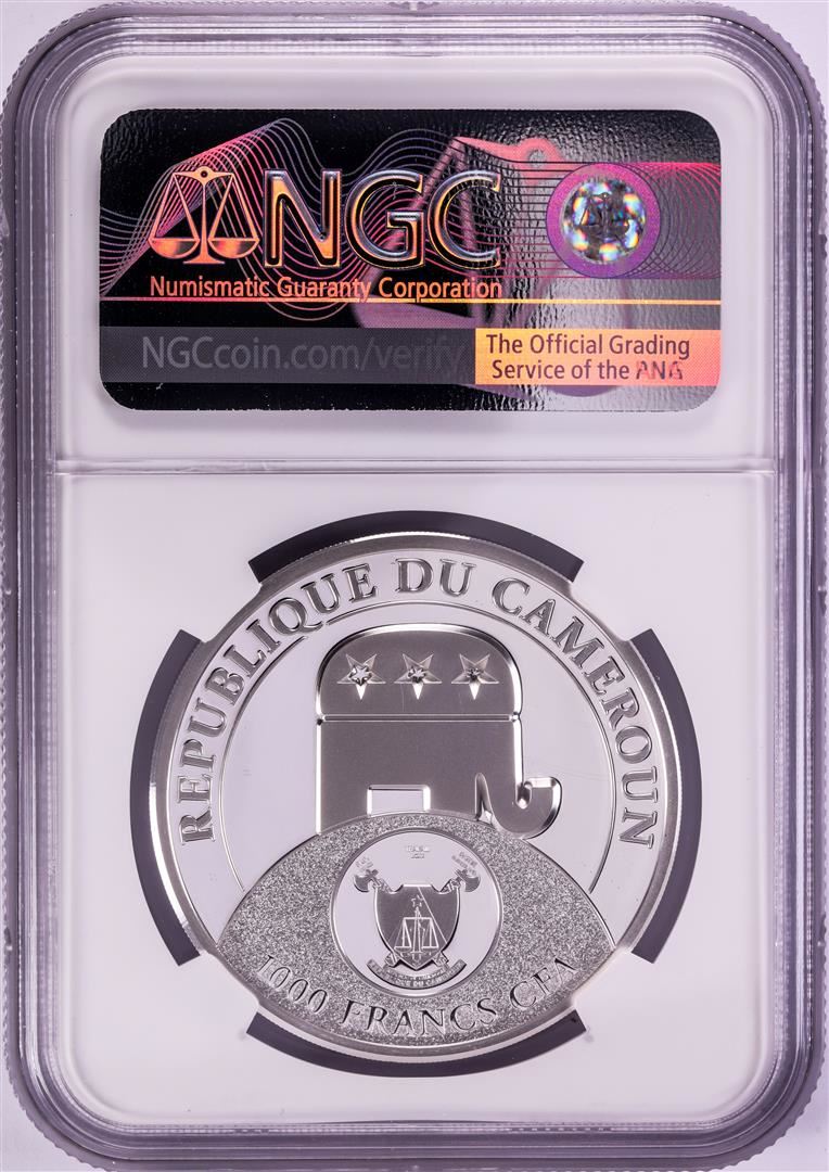 One 2020 Cameroon 1000 Francs High Relief Donald Trump Silver Coin NGC PF70 Ultra Cameo. NGC Certified.