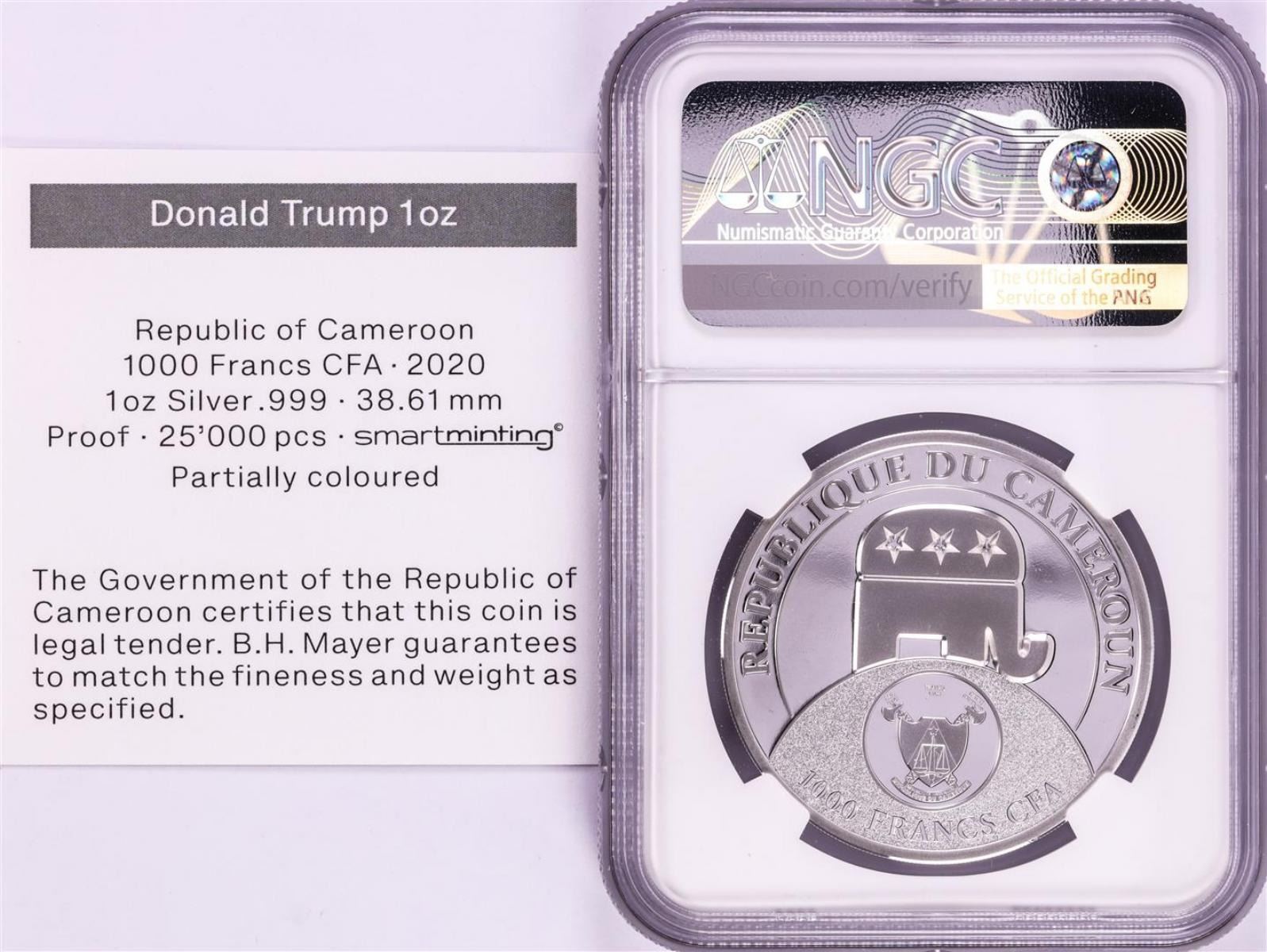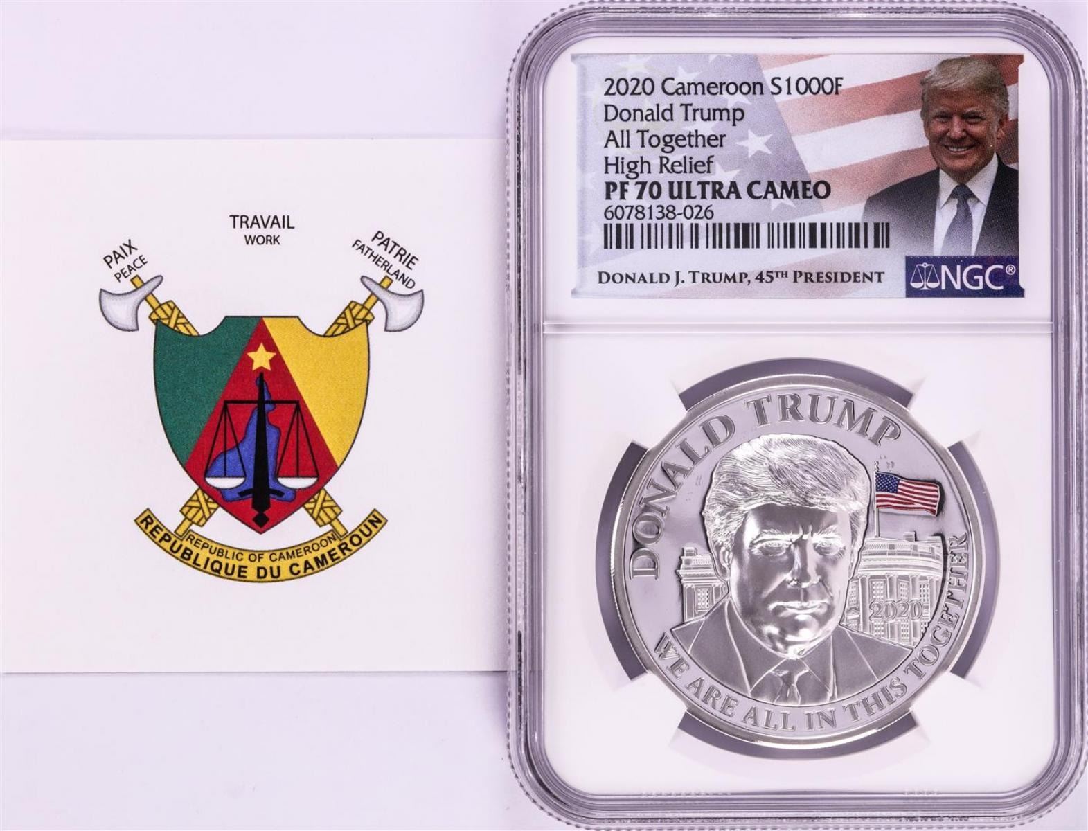 One 2020 Cameroon S1000F Donald Trump All Together High Relief PF 70 Ultra Cameo 1oz Silver .999 Coin.