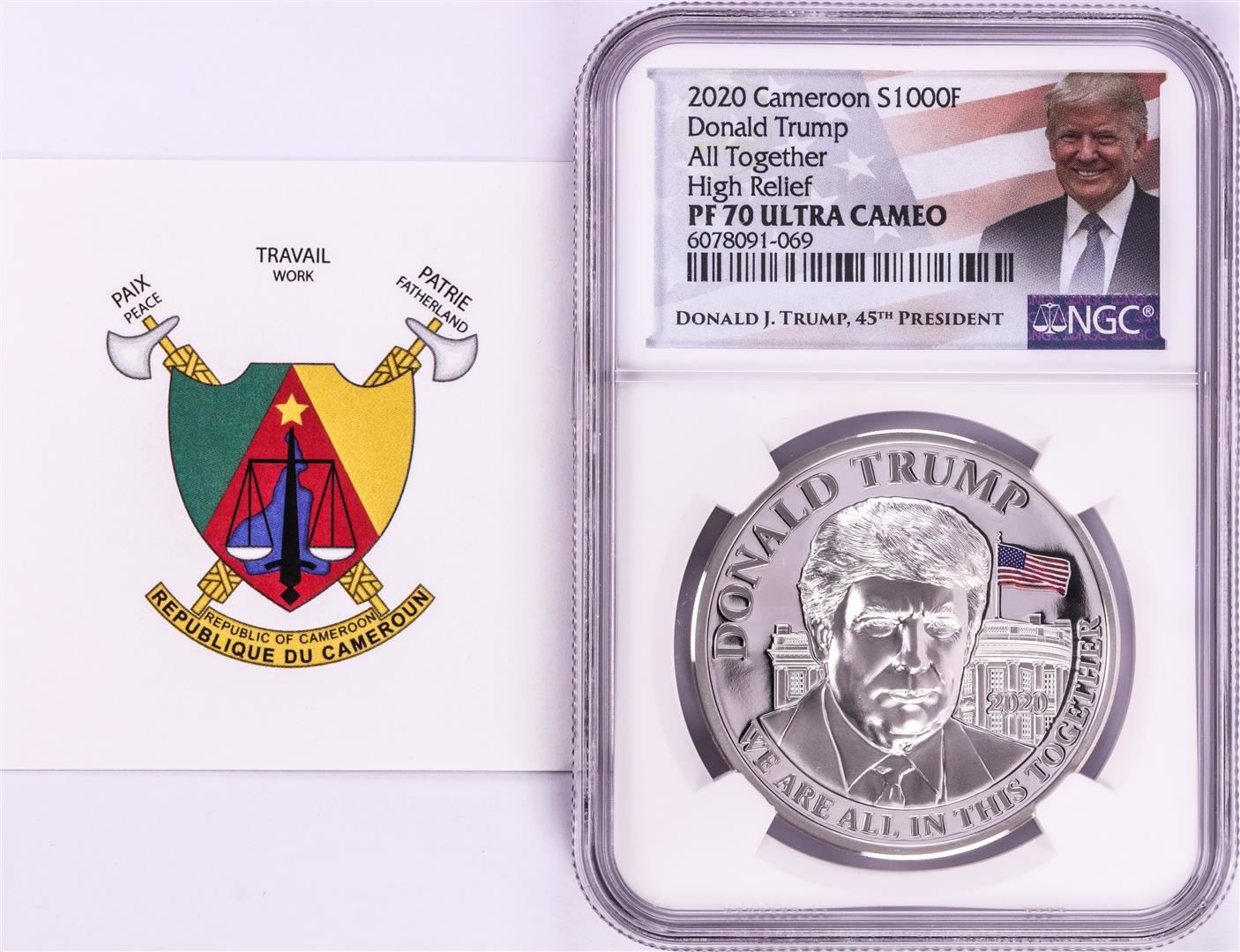 One 2020 Cameroon S1000F Donald Trump All Together High Relief PF 70 Ultra Cameo 1oz Silver .999 Coin.