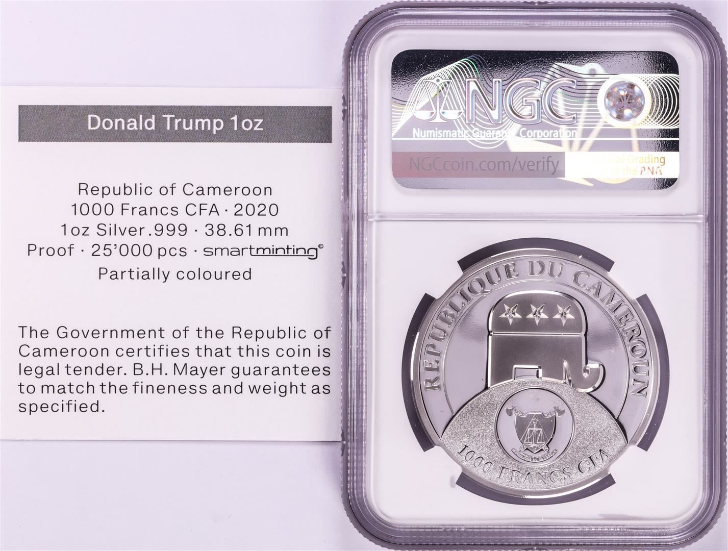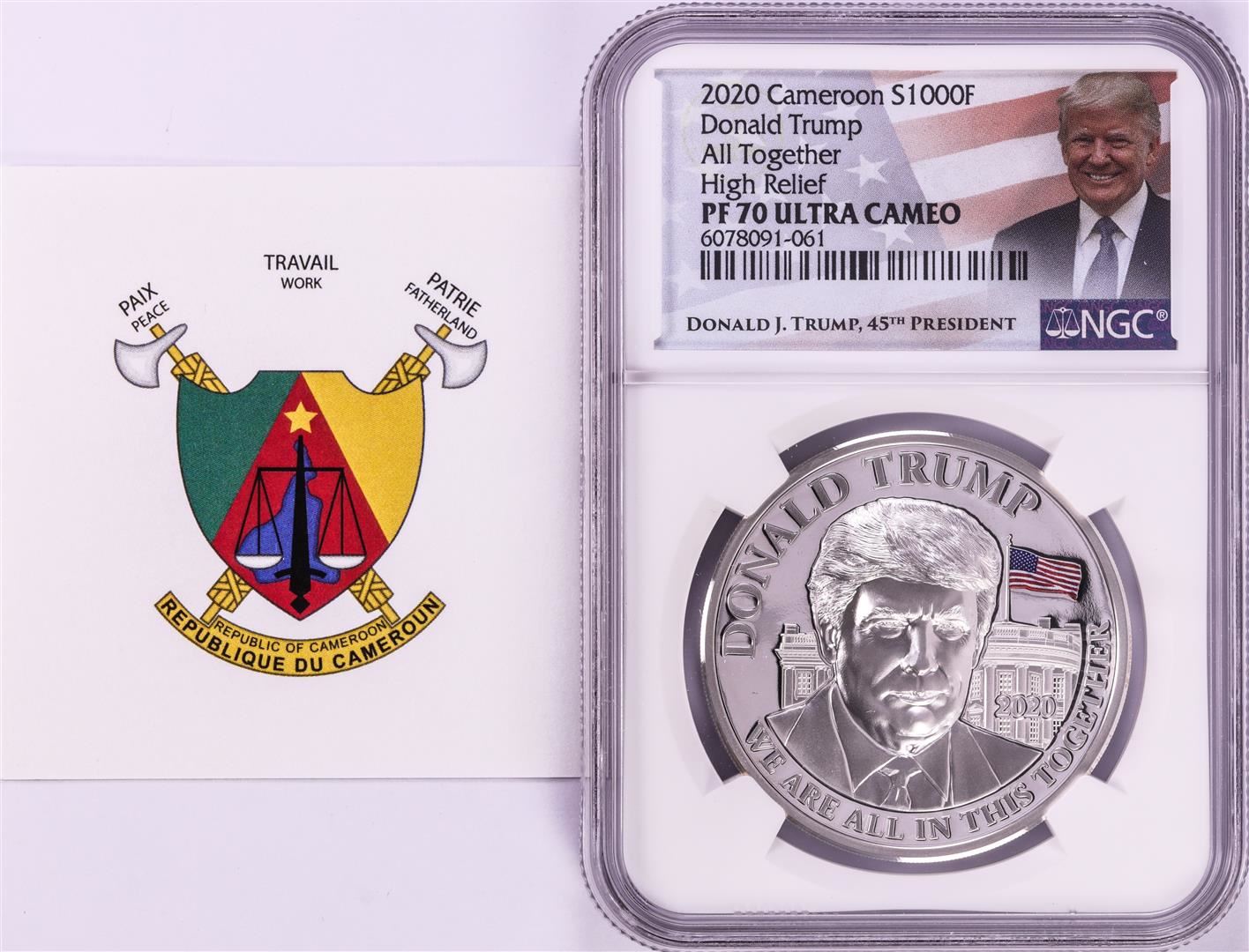 One 2020 Cameroon S1000F Donald Trump All Together High Relief PF 70 Ultra Cameo 1oz Silver .999 Coin.