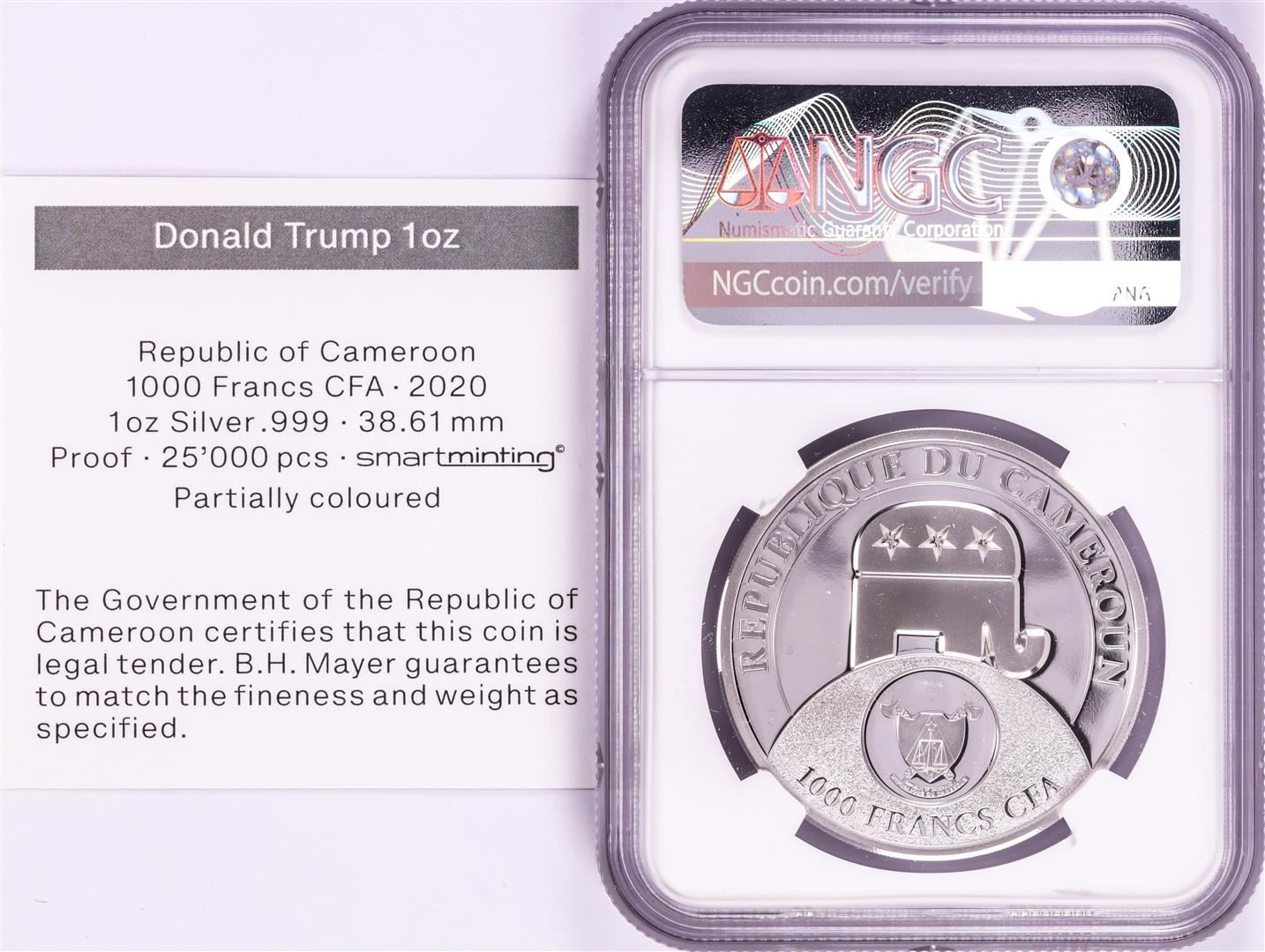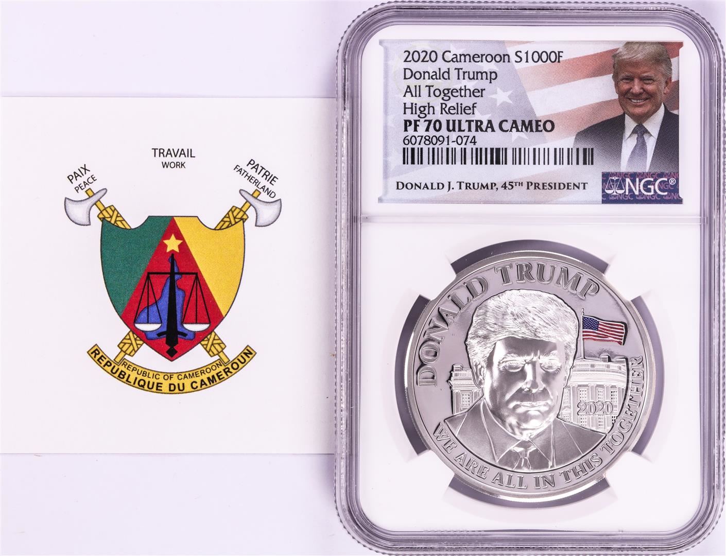 One 2020 Cameroon S1000F Donald Trump All Together High Relief PF 70 Ultra Cameo 1oz Silver .999 Coin.