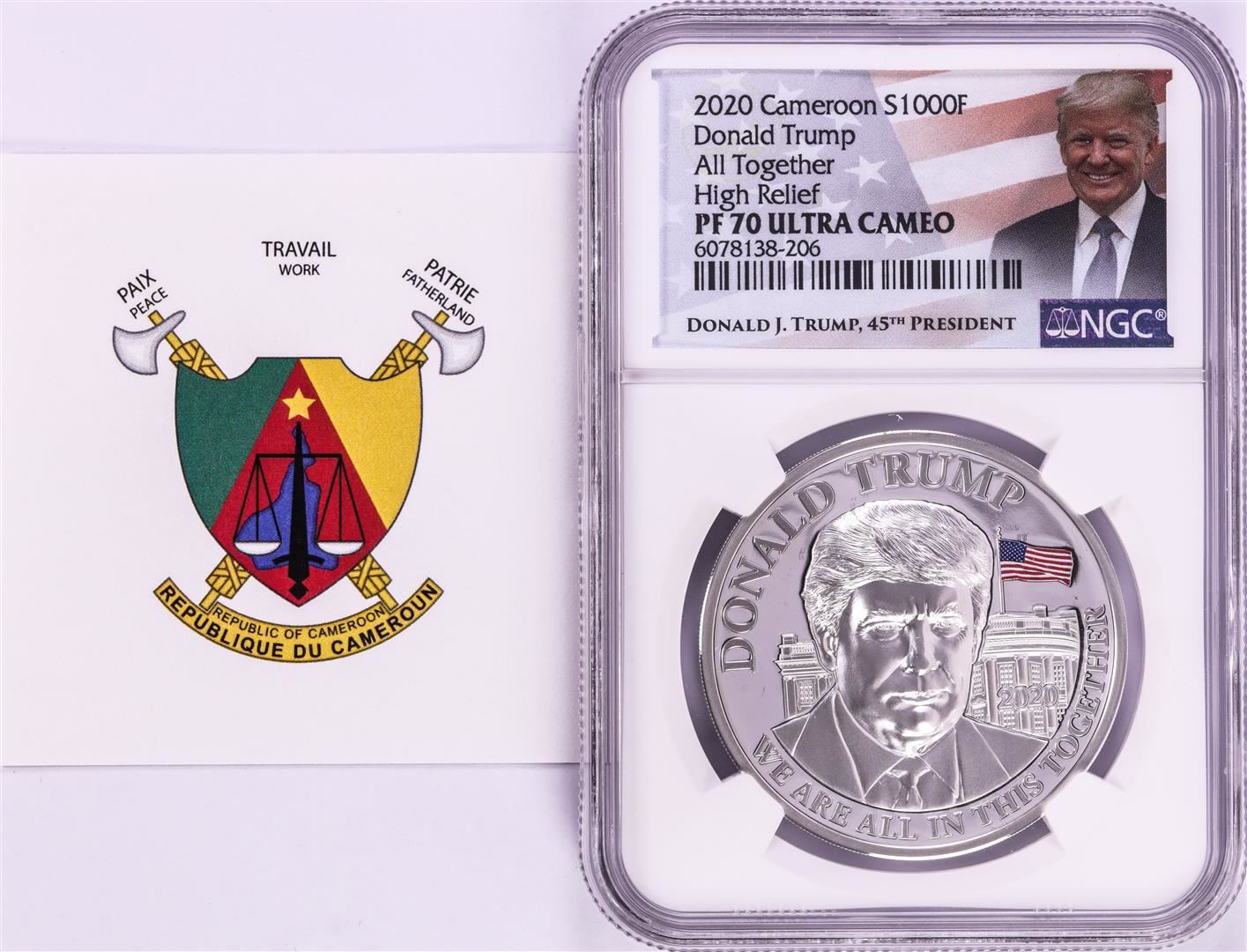 One 2020 Cameroon S1000F Donald Trump All Together High Relief PF 70 Ultra Cameo 1oz Silver .999 Coin.