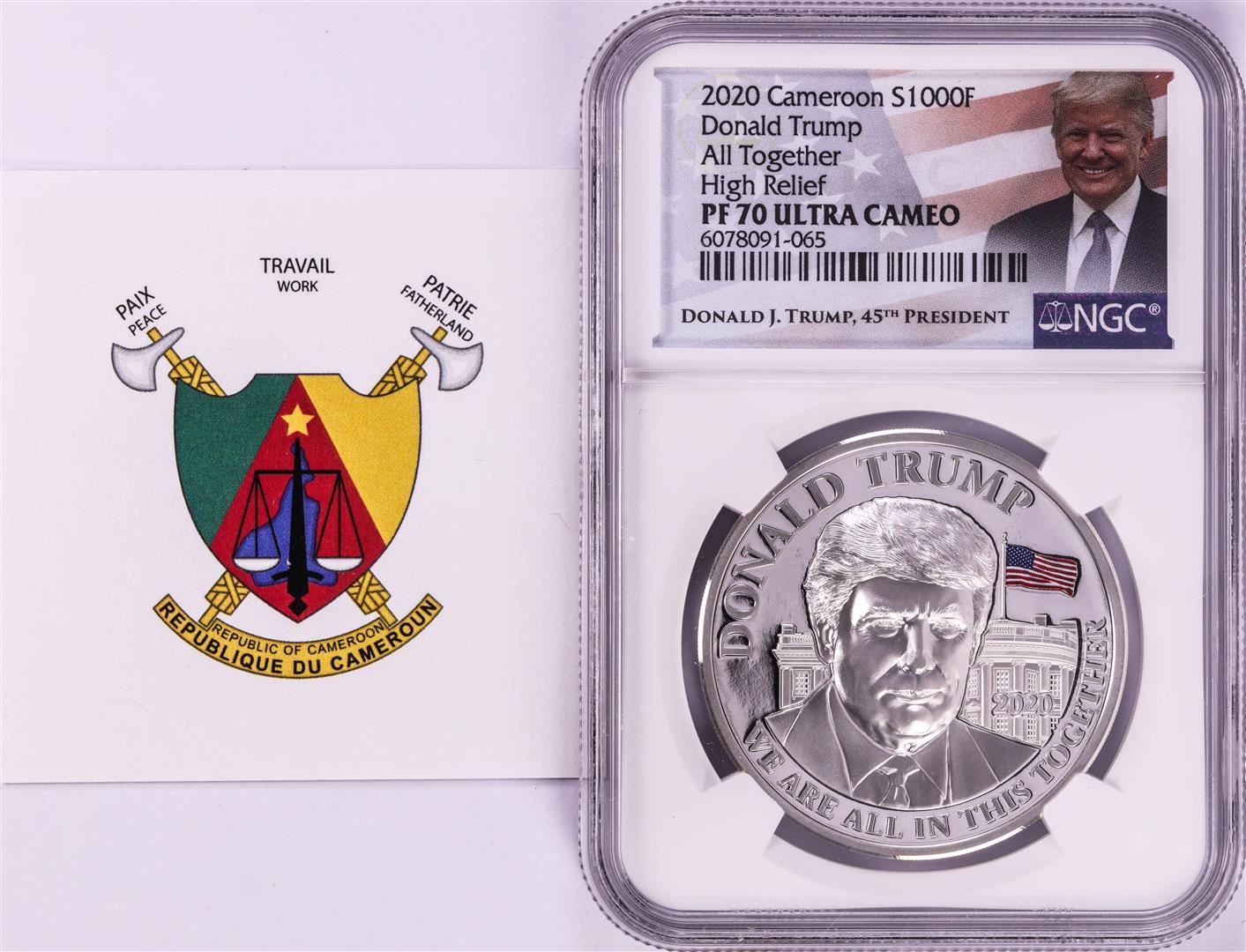 One 2020 Cameroon S1000F Donald Trump All Together High Relief PF 70 Ultra Cameo 1oz Silver .999 Coin.