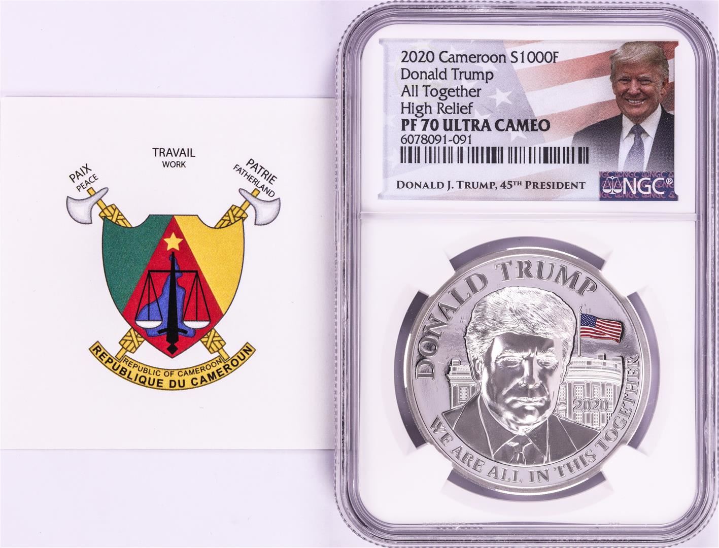 One 2020 Cameroon S1000F Donald Trump All Together High Relief PF 70 Ultra Cameo 1oz Silver .999 Coin.