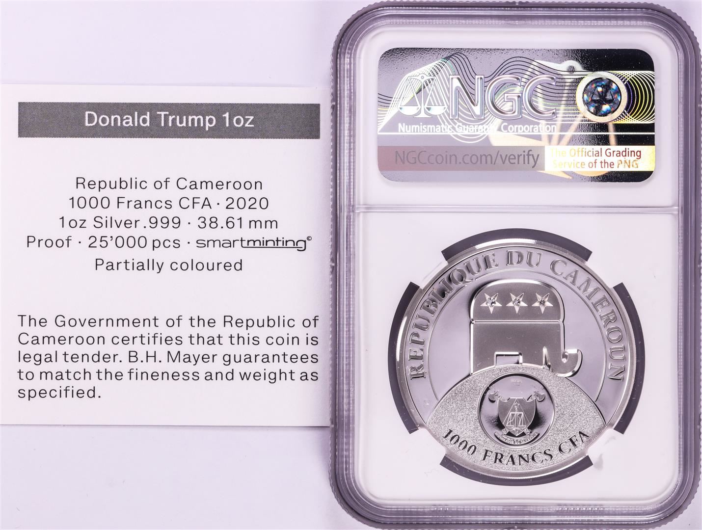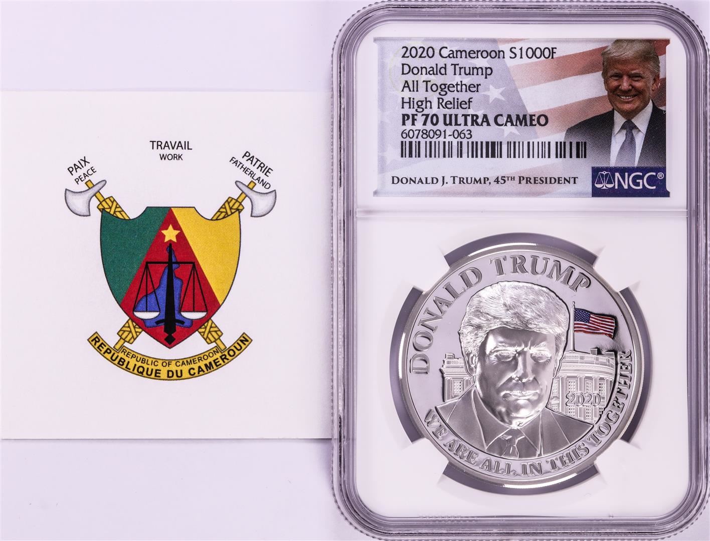 One 2020 Cameroon S1000F Donald Trump All Together High Relief PF 70 Ultra Cameo 1oz Silver .999 Coin.
