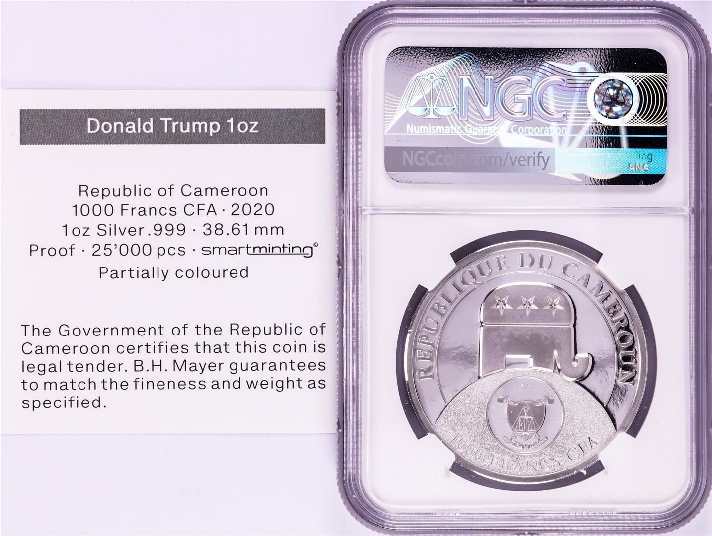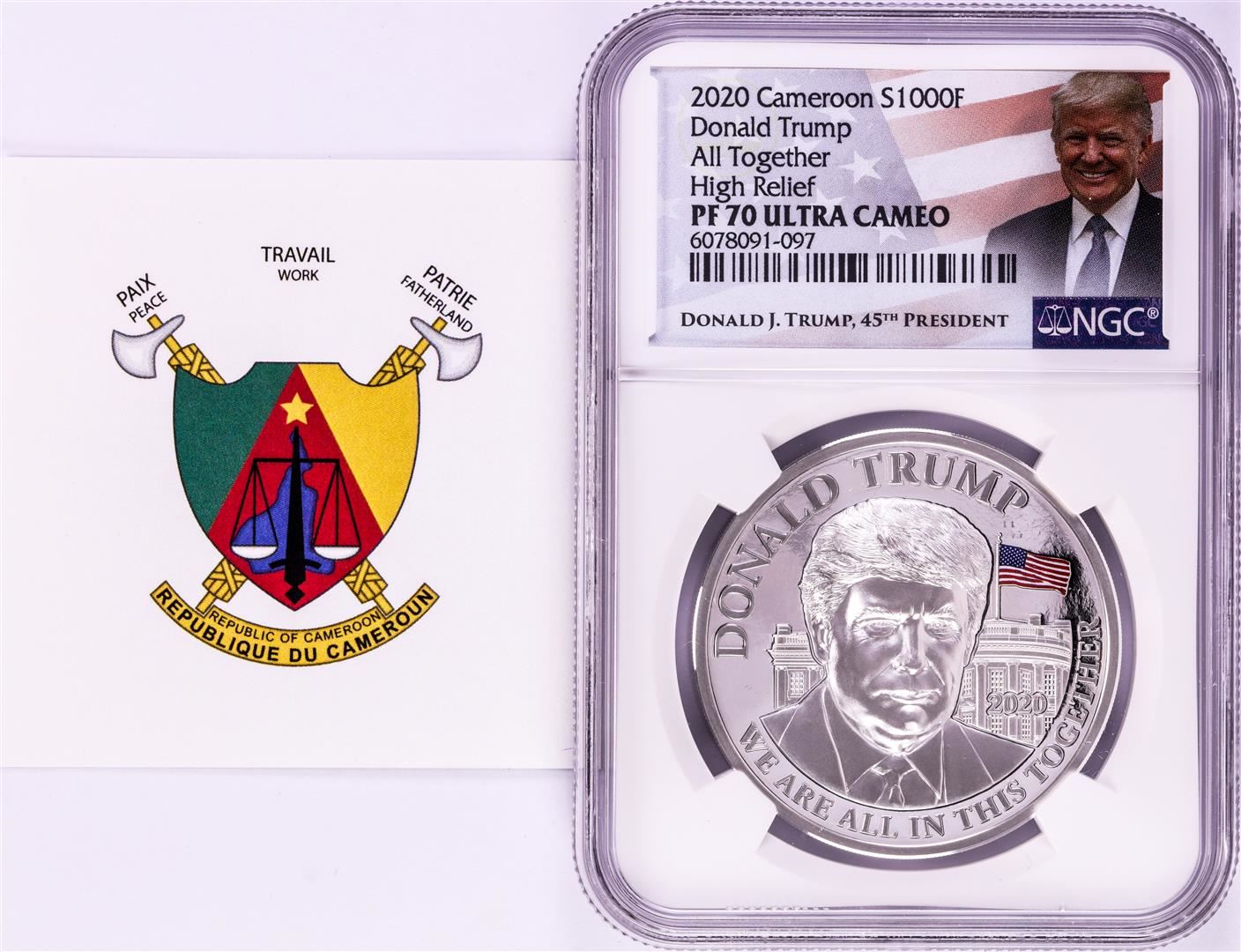 One 2020 Cameroon S1000F Donald Trump All Together High Relief PF 70 Ultra Cameo 1oz Silver .999 Coin.
