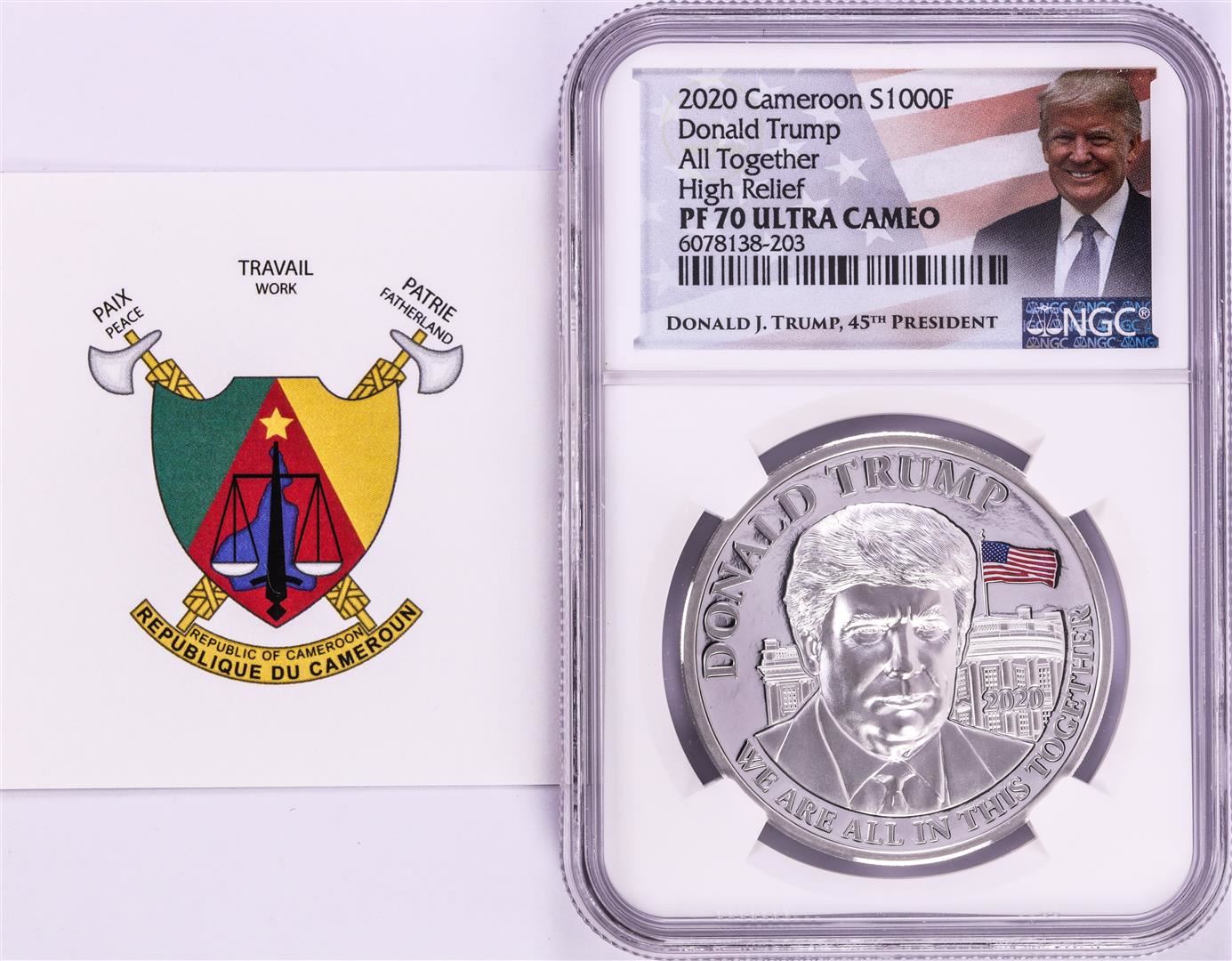 One 2020 Cameroon S1000F Donald Trump All Together High Relief PF 70 Ultra Cameo 1oz Silver .999 Coin.