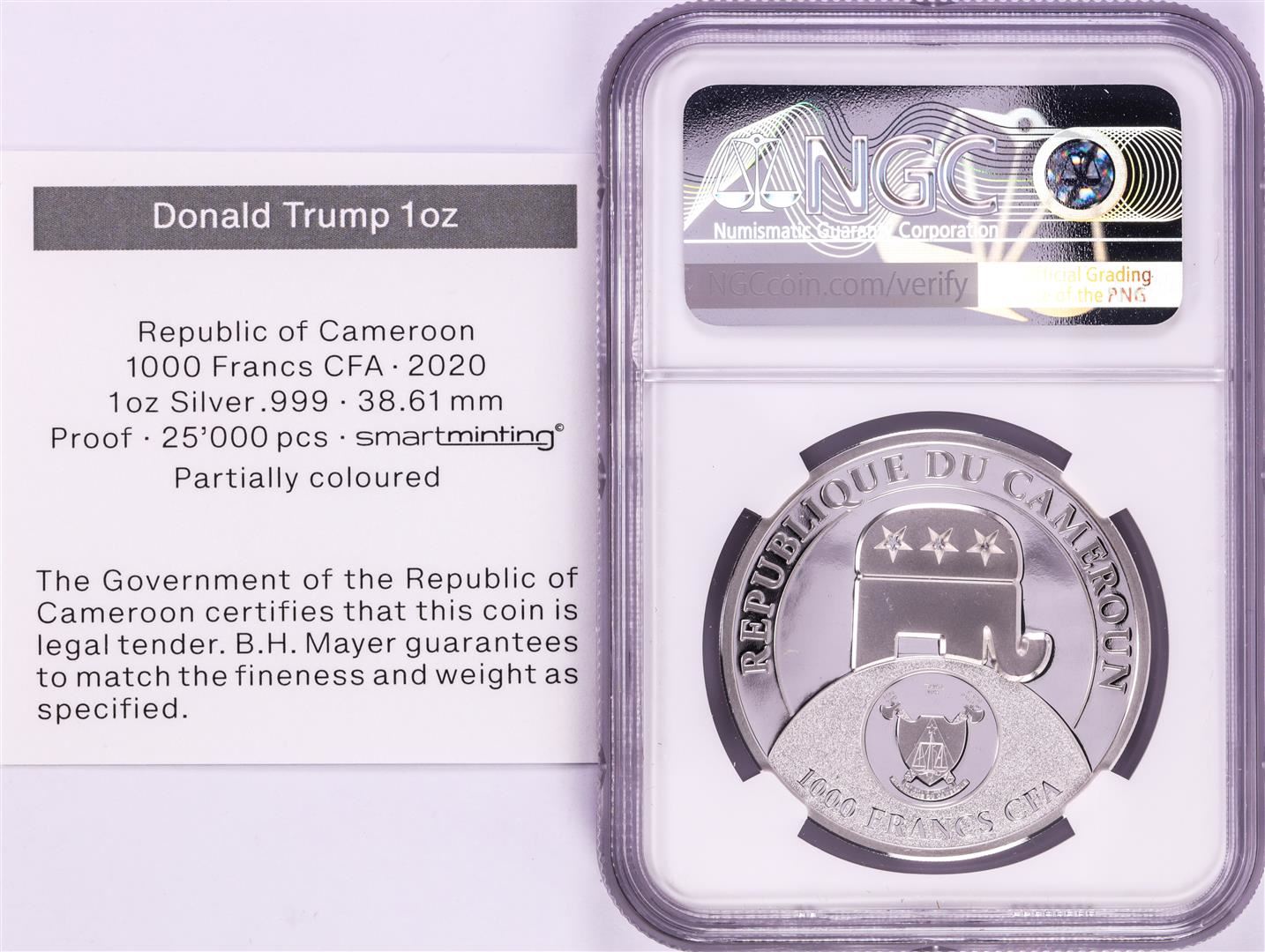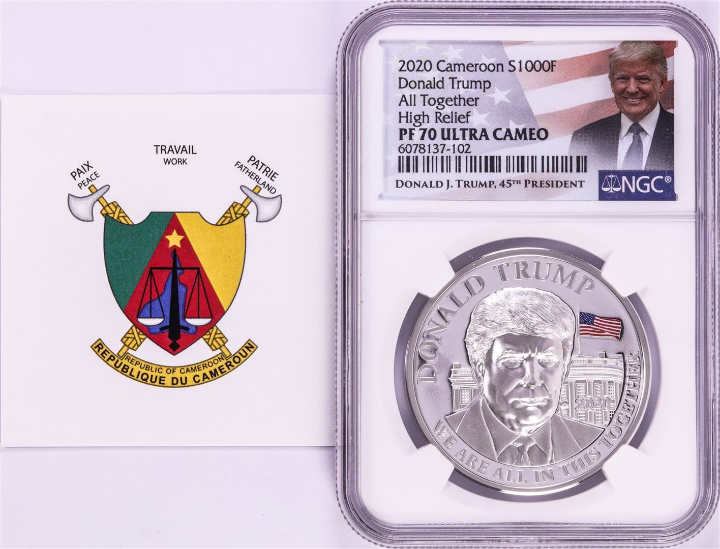 One 2020 Cameroon S1000F Donald Trump All Together High Relief PF 70 Ultra Cameo 1oz Silver .999 Coin.