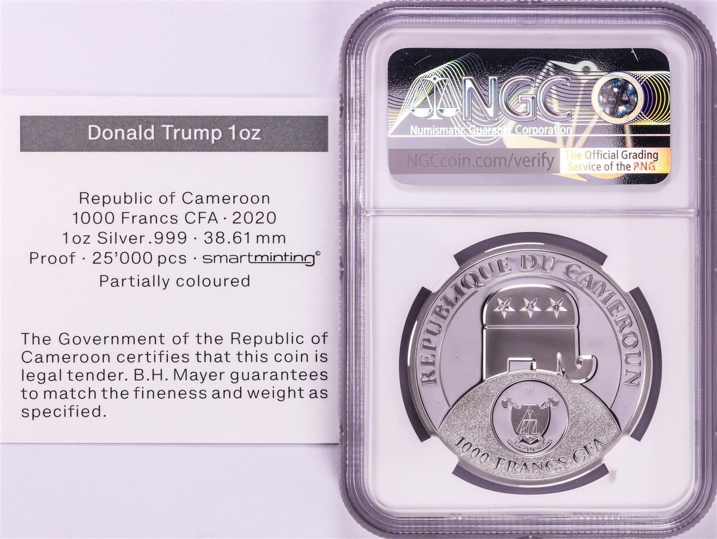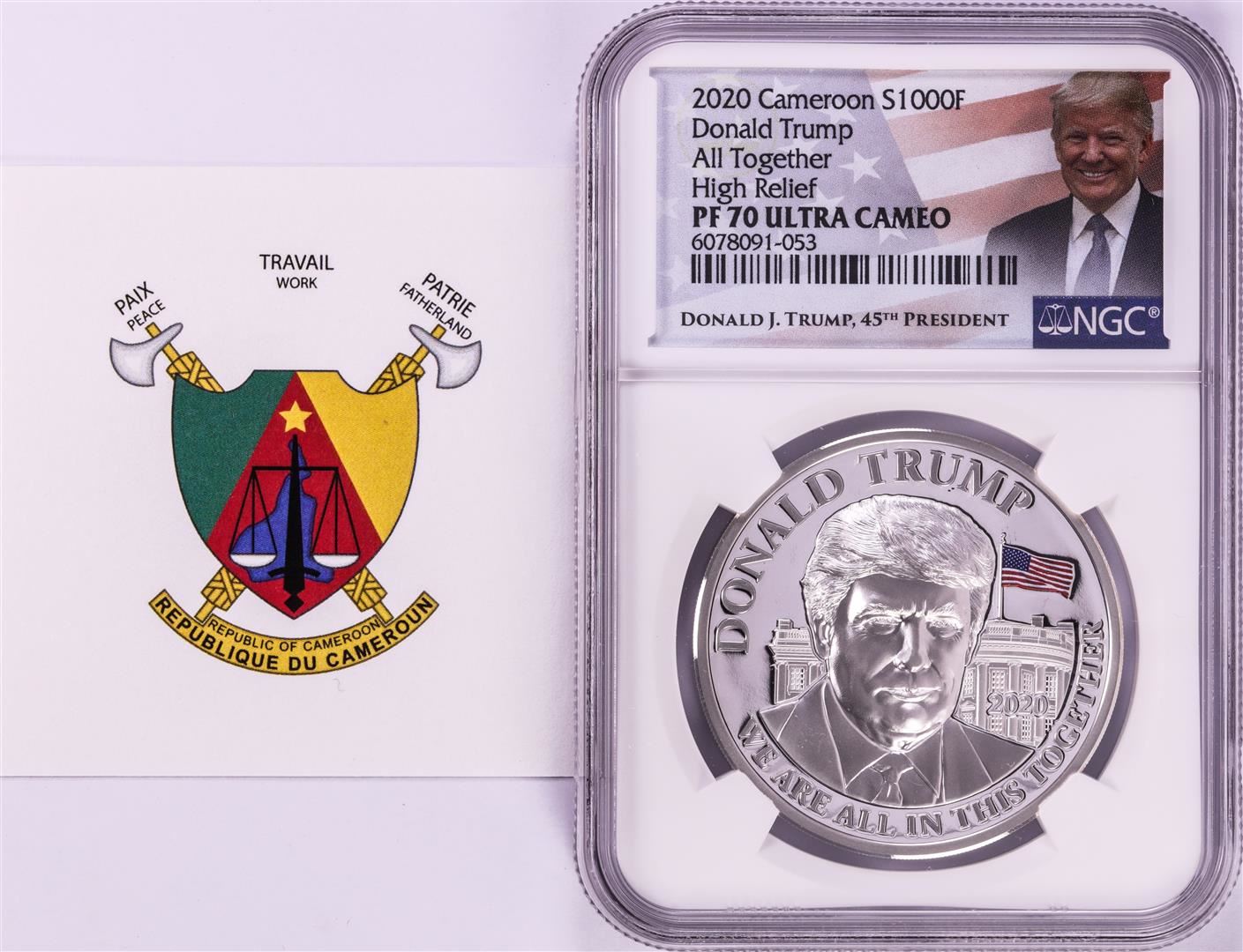 One 2020 Cameroon S1000F Donald Trump All Together High Relief PF 70 Ultra Cameo 1oz Silver .999 Coin.