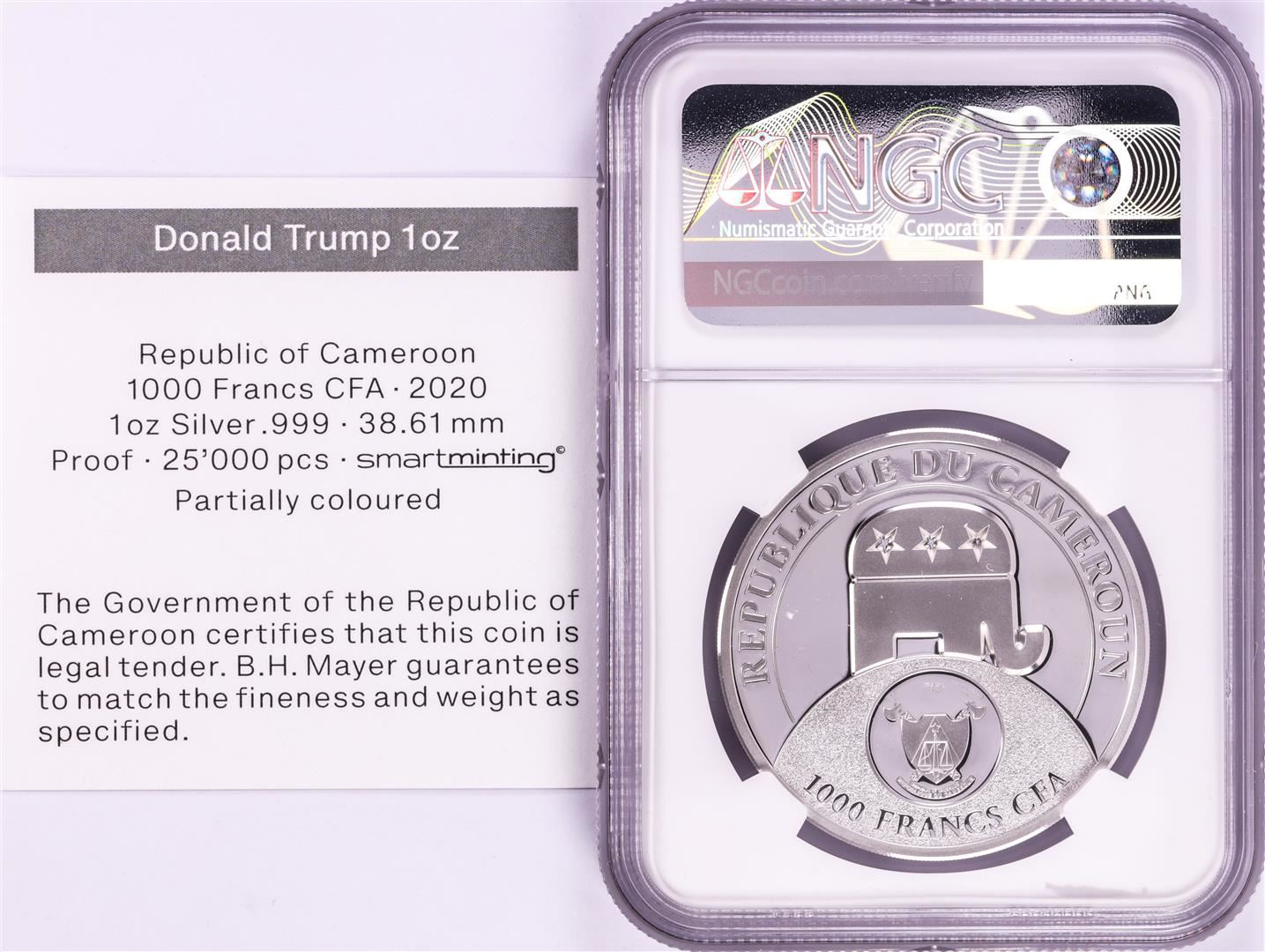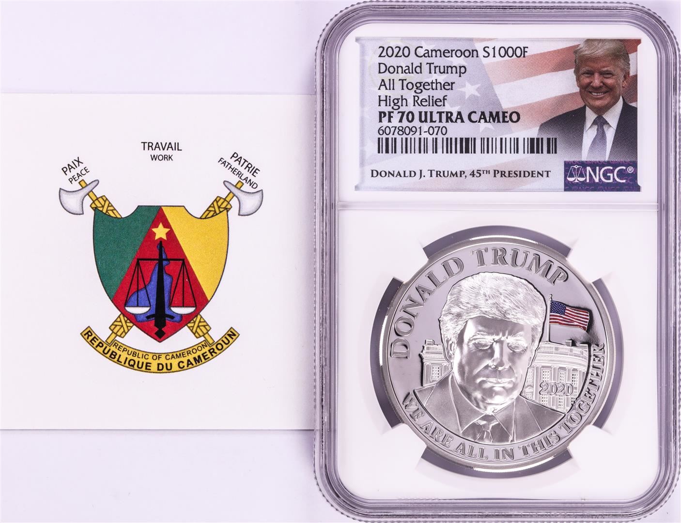 One 2020 Cameroon S1000F Donald Trump All Together High Relief PF 70 Ultra Cameo 1oz Silver .999 Coin.