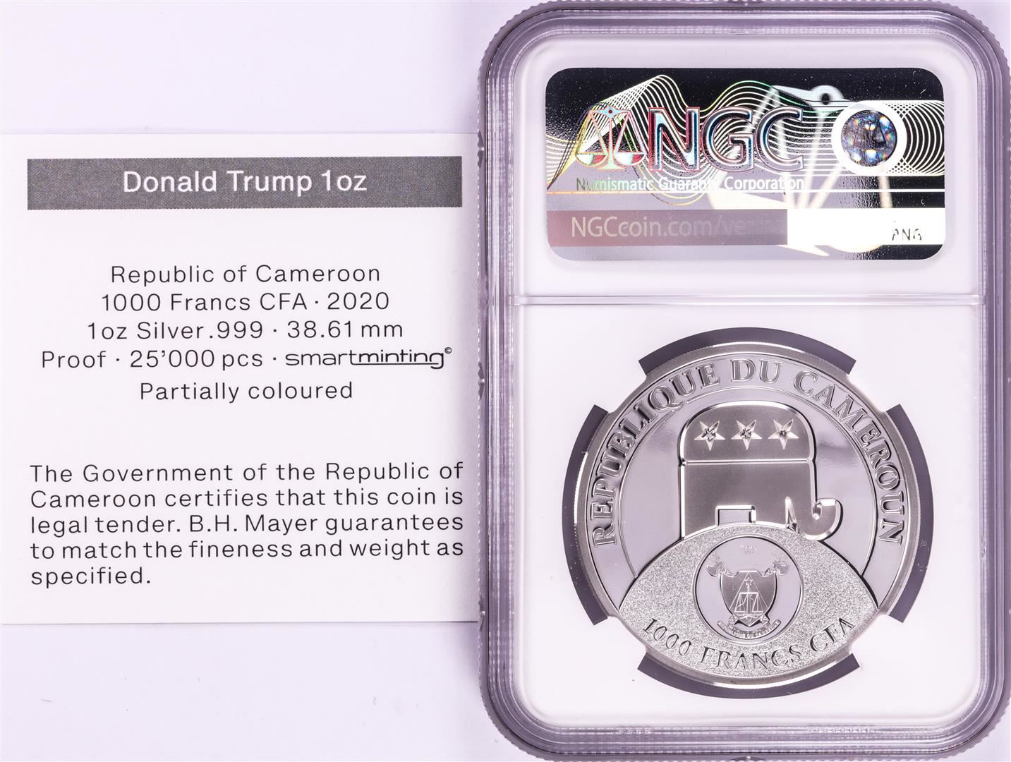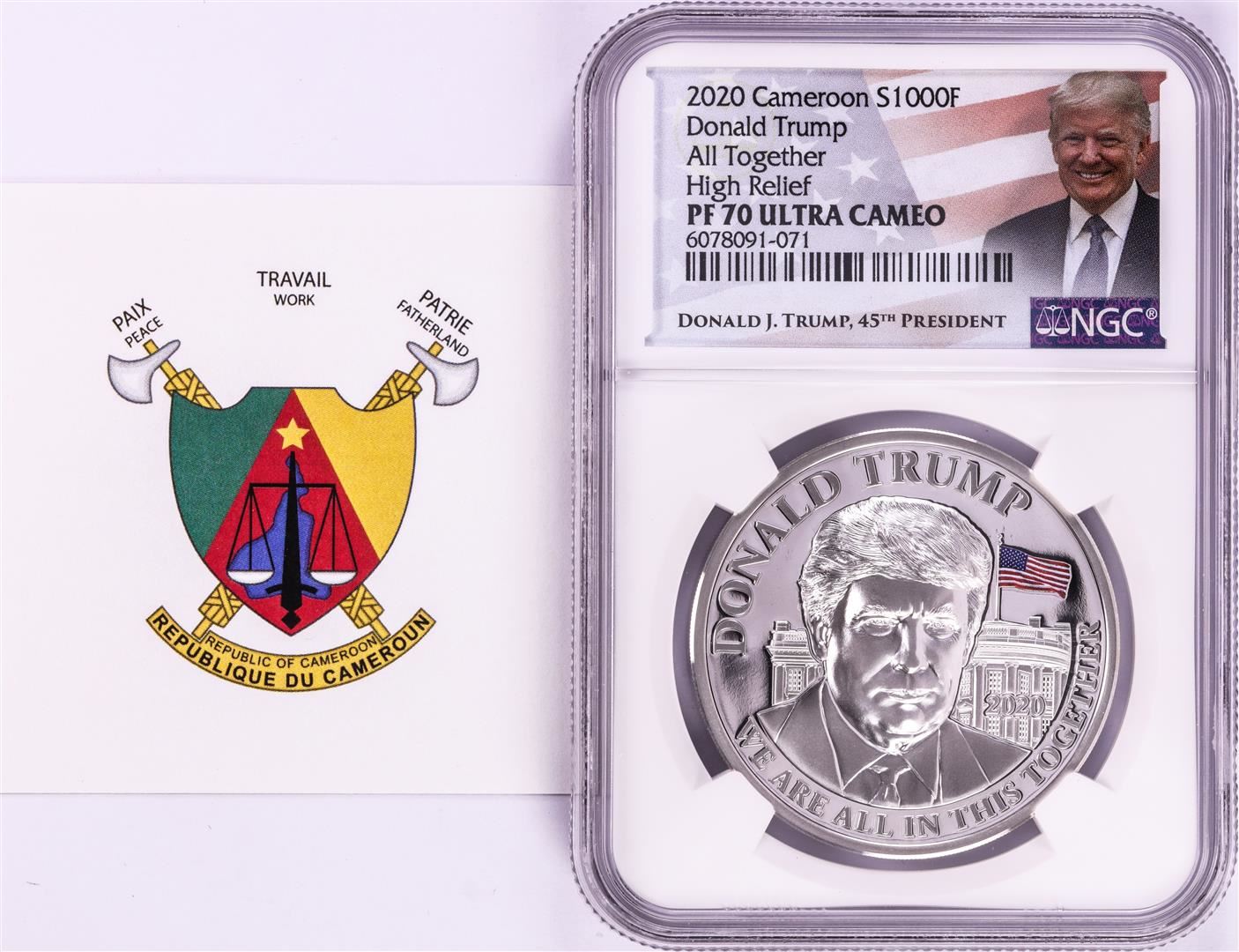 One 2020 Cameroon S1000F Donald Trump All Together High Relief PF 70 Ultra Cameo 1oz Silver .999 Coin.