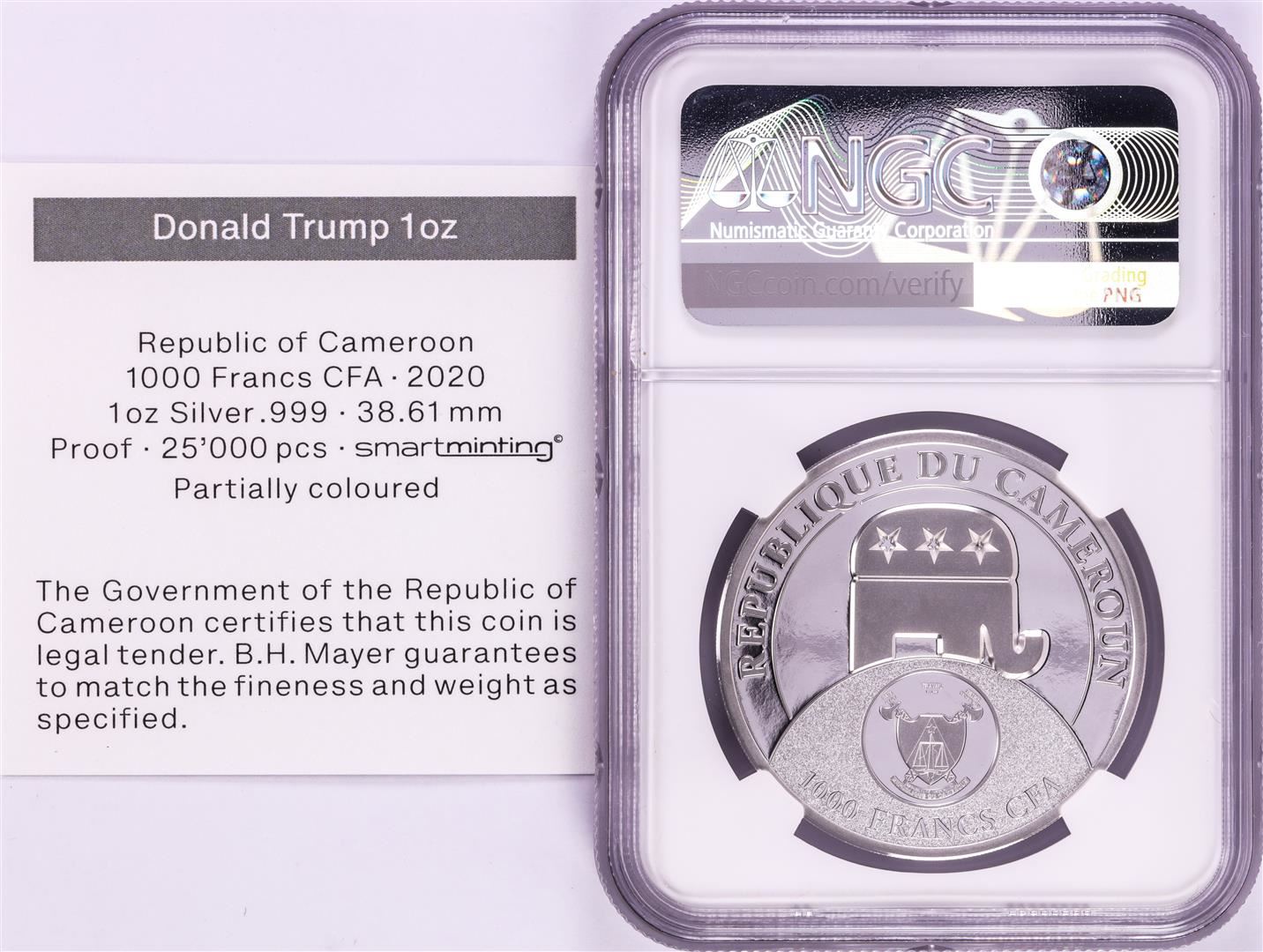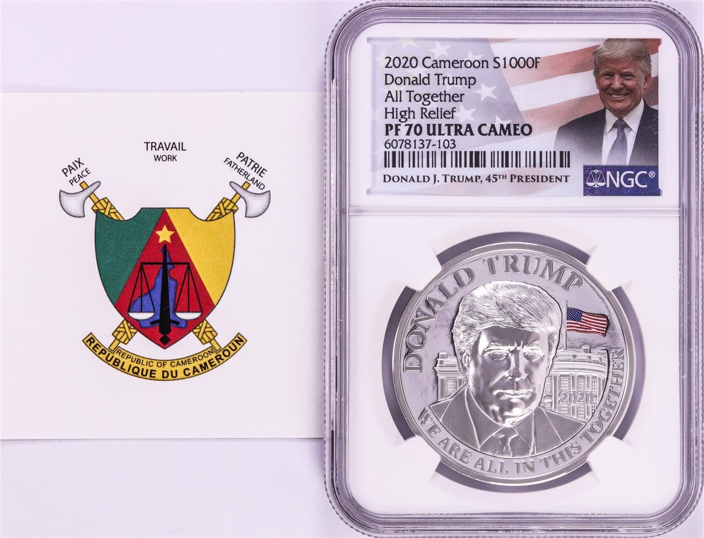 One 2020 Cameroon S1000F Donald Trump All Together High Relief PF 70 Ultra Cameo 1oz Silver .999 Coin.