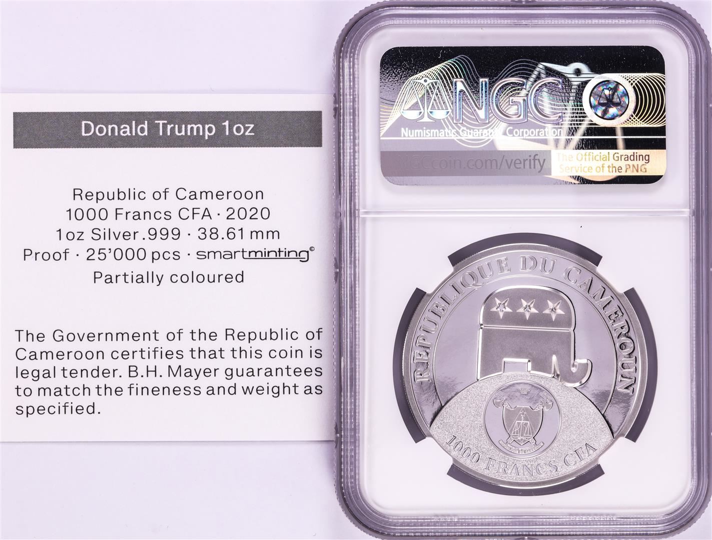 One 2020 Cameroon S1000F Donald Trump All Together High Relief PF 70 Ultra Cameo 1oz Silver .999 Coin.
