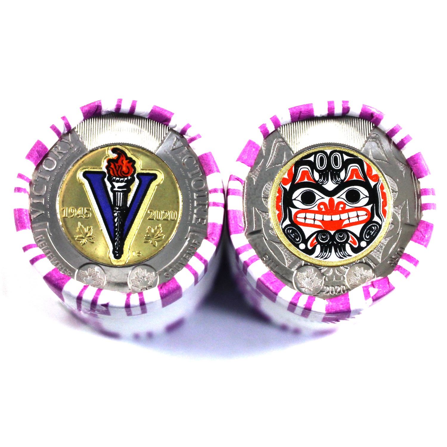 2020 Canada $2 Bill Reid & 75th Anniversary of the End of WWII Original Rolls with Some Coloured (WWII roll is torn). 2pcs