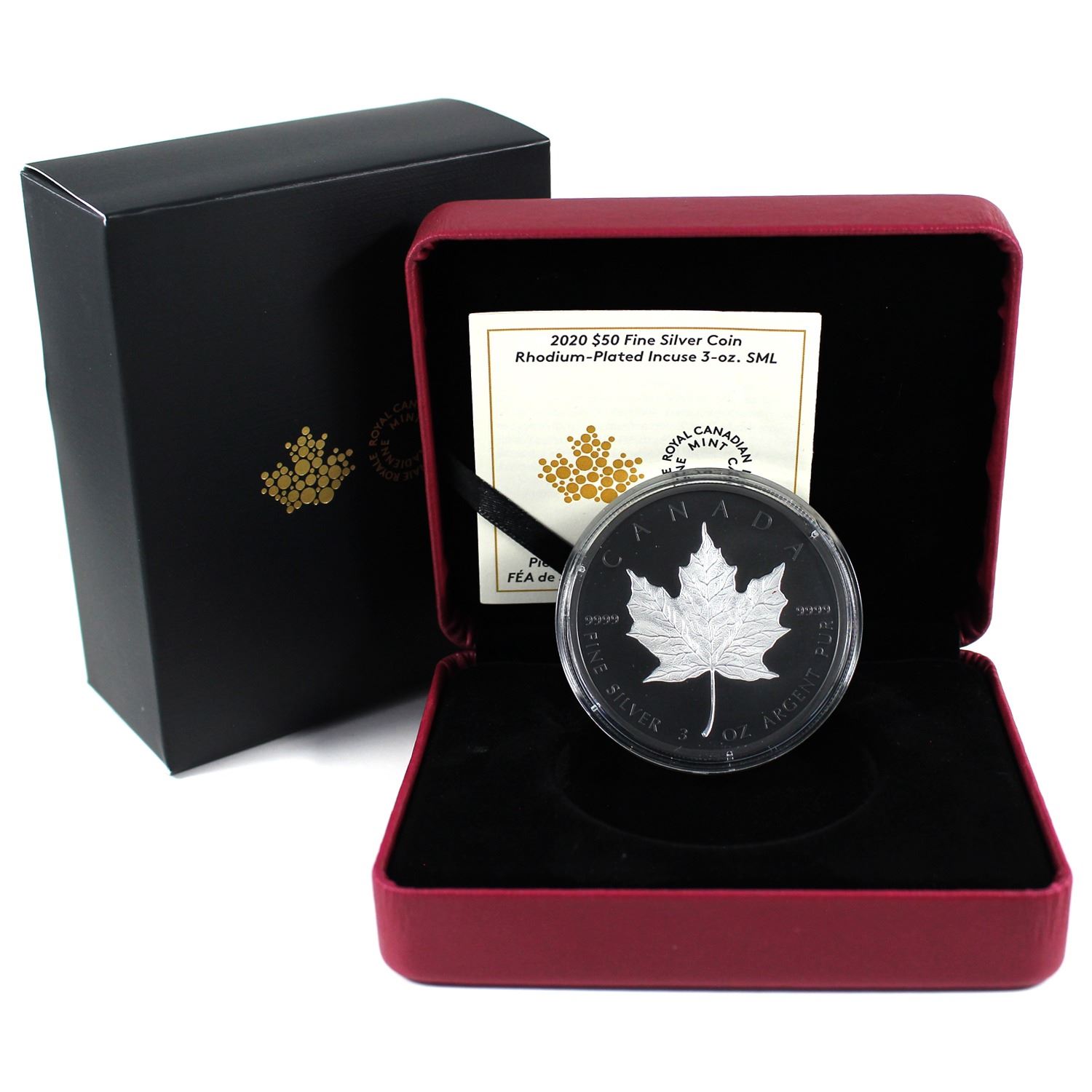 2020 Canada $50 Black Rhodium Plated Incuse 3oz Fine Silver Maple Leaf (Sleeve has light bend). Tax Exempt