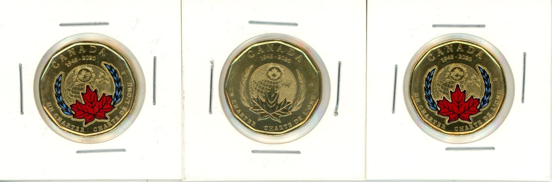 2020 Canadian One Dollar commemorating the 75th anniversary of the United Nations (UN) and its Charter (1) Colored and (2) Uncolored.