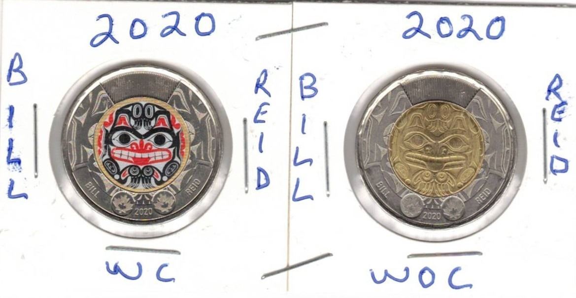 2020 Canadian Toonie, Bill Reid With Colour and Without Colour