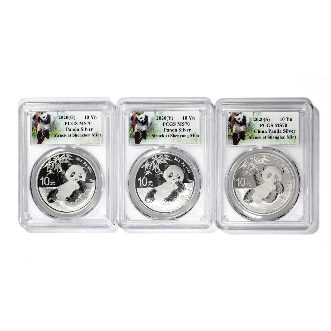 One 2020 China 10 Yuan Silver Panda (3) Coin Set PCGS MS70 Shenyang Mint w/COA. PCGS Graded.