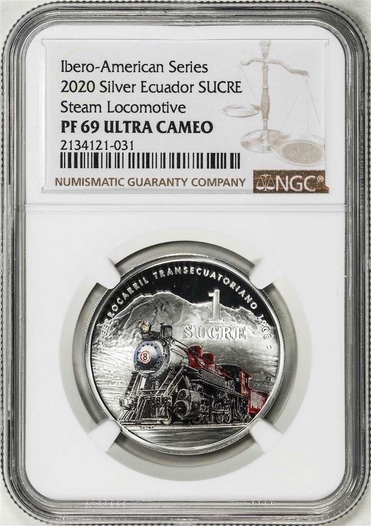 One 2020 Ecuador 1 Sucre Steam Locomotive Ibero Train Silver Coin NGC PF69 Ultra Cameo. NGC Certified.