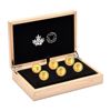 INCLUDES: $1, 50-cent, 25-cent, 10-cent, 5-cent & 1-cent Pure Gold Coins. Each Coin 1/10oz .9999 Gold. Comes with Maple Wood Case & Booklet featuring rare images of the production tooling of the 1967 circulation coinage. Glue lifting/damage to outer box (Tax Exempt)