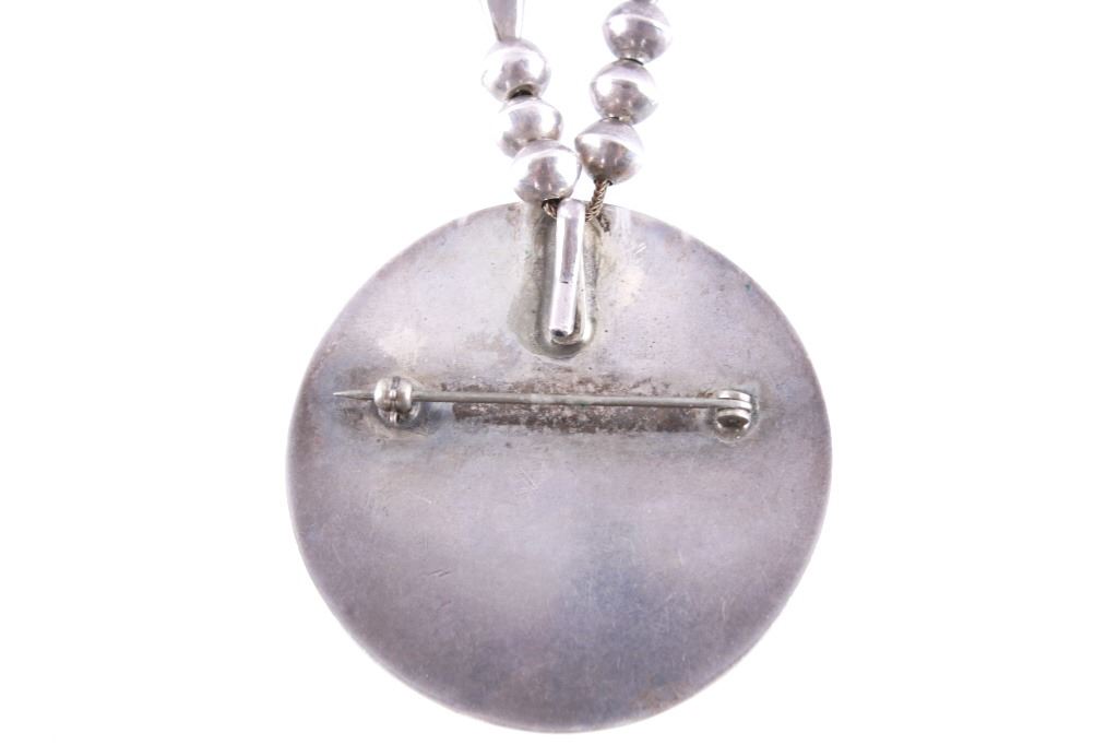 Featured in this lot is this Navajo sterling silver and Morenci turquoise shadowbox necklace. The necklace features a wonderfully and professionally crafted sterling silver construction with silver beaded necklace strung on a silver box chain and features a shadowbox pendant constructed from a brooch with a single Morenci turquoise with a brilliant dark brown spiderwebbed matrix. The condition of this necklace is good with no obvious signs of damage and in good overall condition. The measurements of this necklace from clasp to clasp is 22" and the pendant measures 2" x 2" x 3/8". The collective weight of this necklace is 48.4g.
