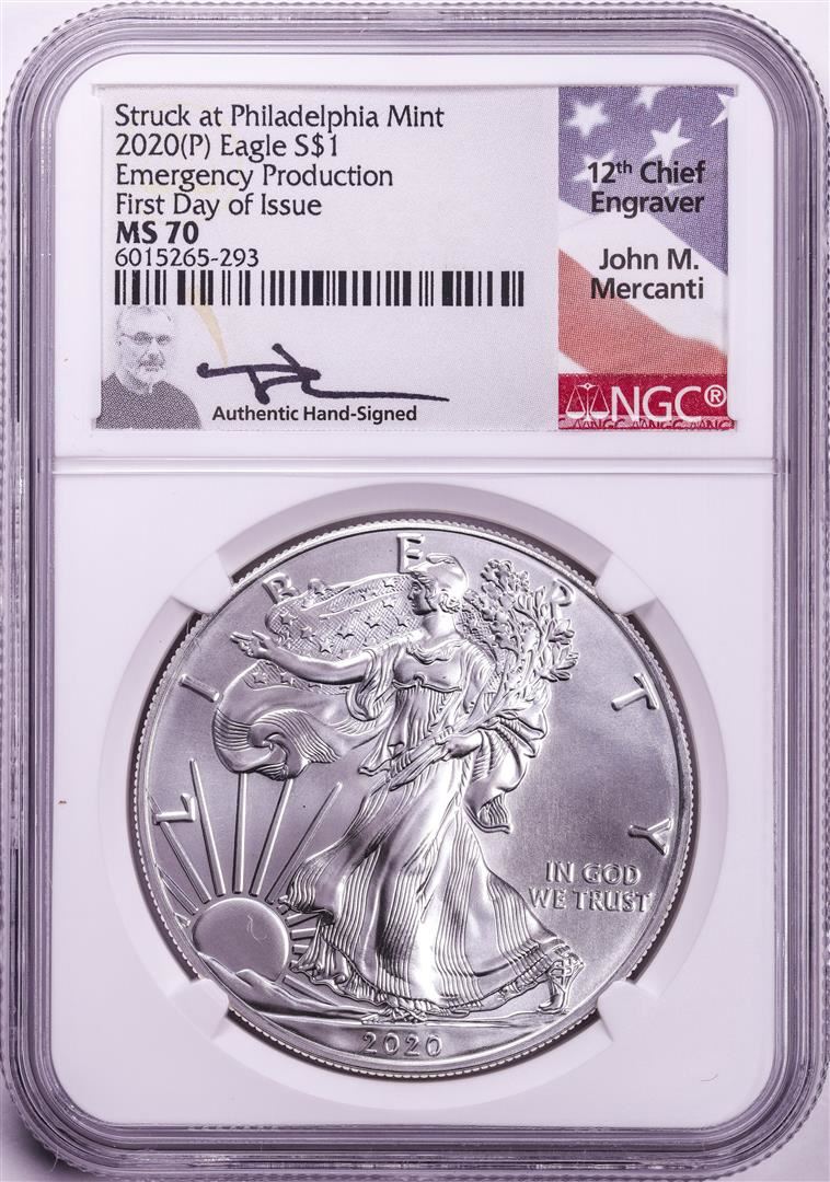 2020-(P) $1 American Silver Eagle Coin NGC MS70 FDOI Mercanti Emergency Philadelphia