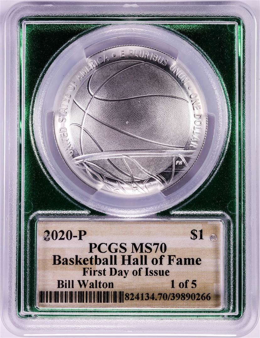 One 2020-P $1 Basketball HOF Silver Dollar Coin PCGS MS70 Bill Walton Signature FDOI. PCGS Graded.