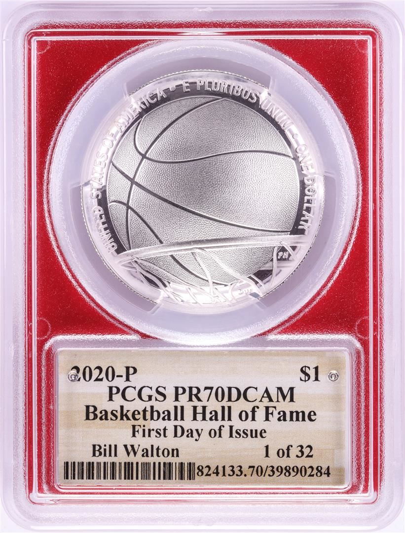 One 2020-P $1 Basketball HOF Silver Dollar Coin PCGS PR70DCAM Bill Walton Signature FDOI. PCGS Graded.