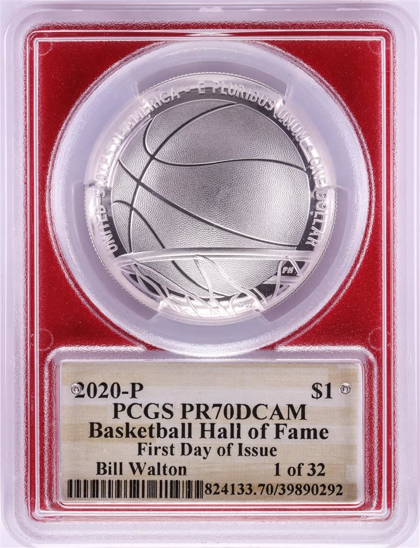 One 2020-P $1 Basketball HOF Silver Dollar Coin PCGS PR70DCAM Bill Walton Signature FDOI. PCGS Graded.