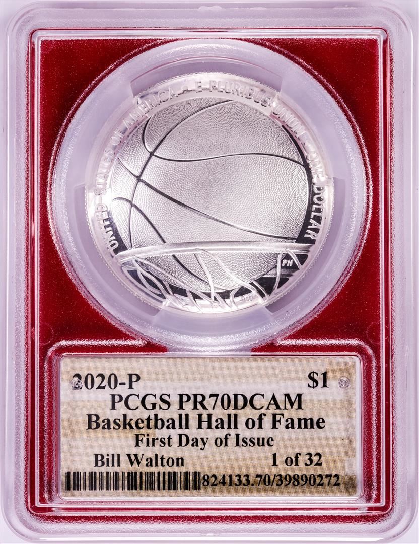 One 2020-P $1 Basketball HOF Silver Dollar Coin PCGS PR70DCAM Bill Walton Signature FDOI. PCGS Graded.