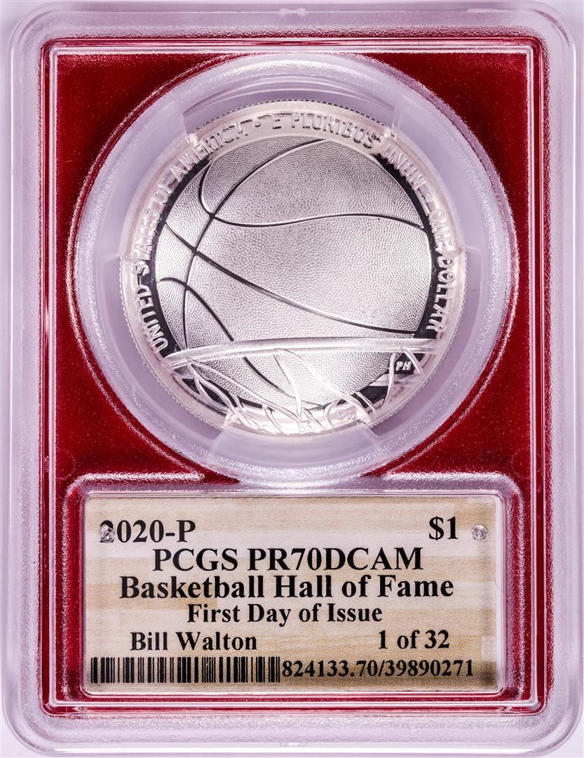 One 2020-P $1 Basketball HOF Silver Dollar Coin PCGS PR70DCAM Bill Walton Signature FDOI. PCGS Graded.
