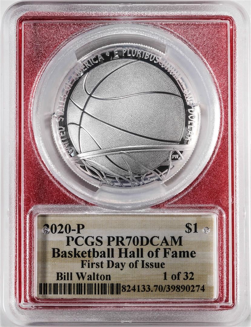 One 2020-P $1 Basketball HOF Silver Dollar Coin PCGS PR70DCAM Bill Walton Signature FDOI. PCGS Graded.