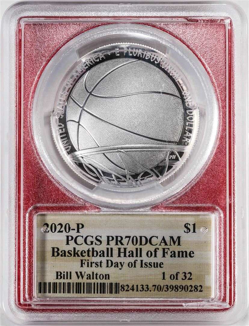 One 2020-P $1 Basketball HOF Silver Dollar Coin PCGS PR70DCAM Bill Walton Signature FDOI. PCGS Graded.