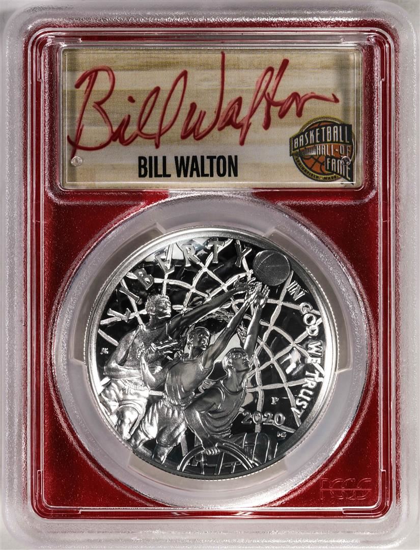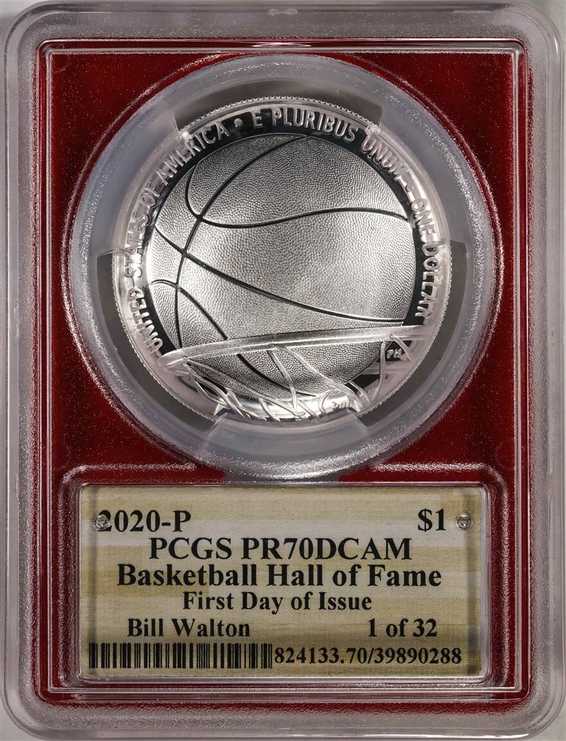 One 2020-P $1 Basketball HOF Silver Dollar Coin PCGS PR70DCAM Bill Walton Signature FDOI. PCGS Graded.