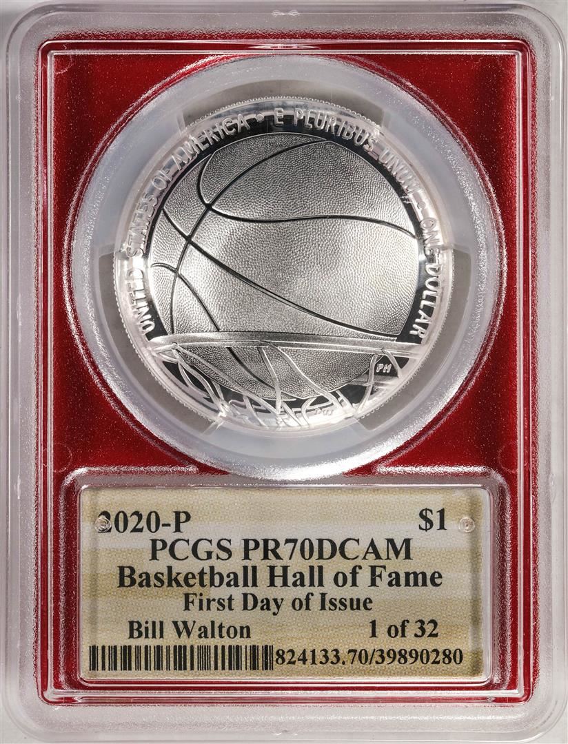 One 2020-P $1 Basketball HOF Silver Dollar Coin PCGS PR70DCAM Bill Walton Signature FDOI. PCGS Graded.