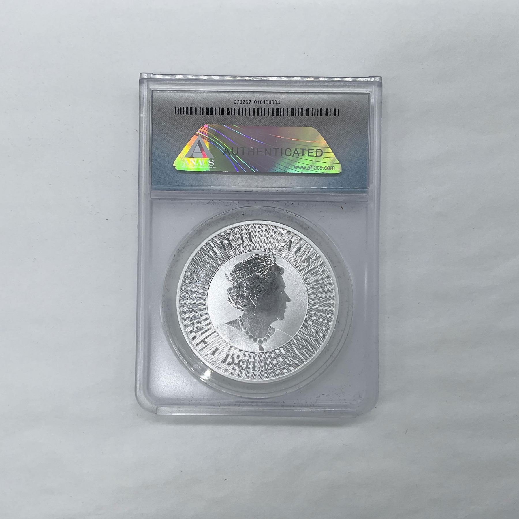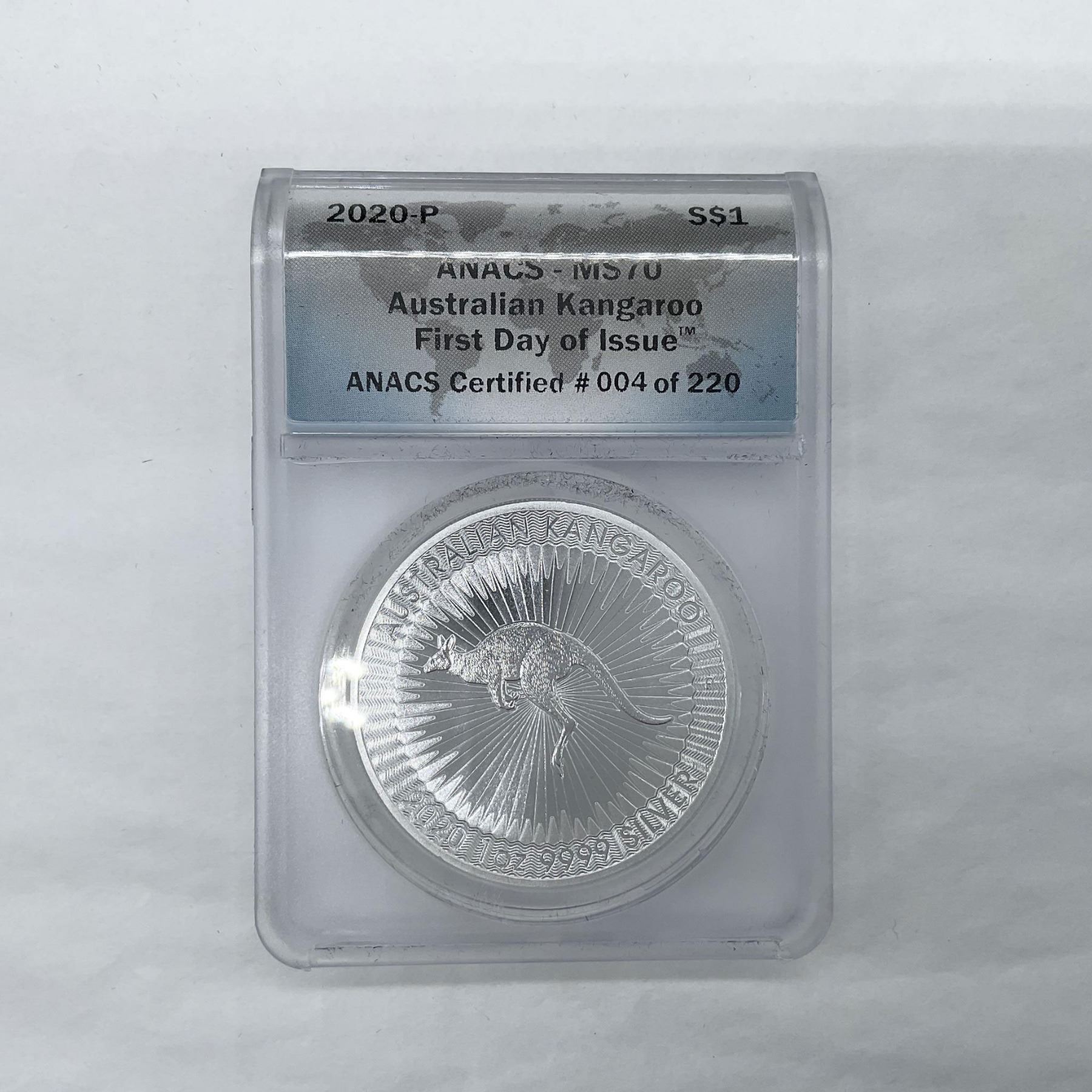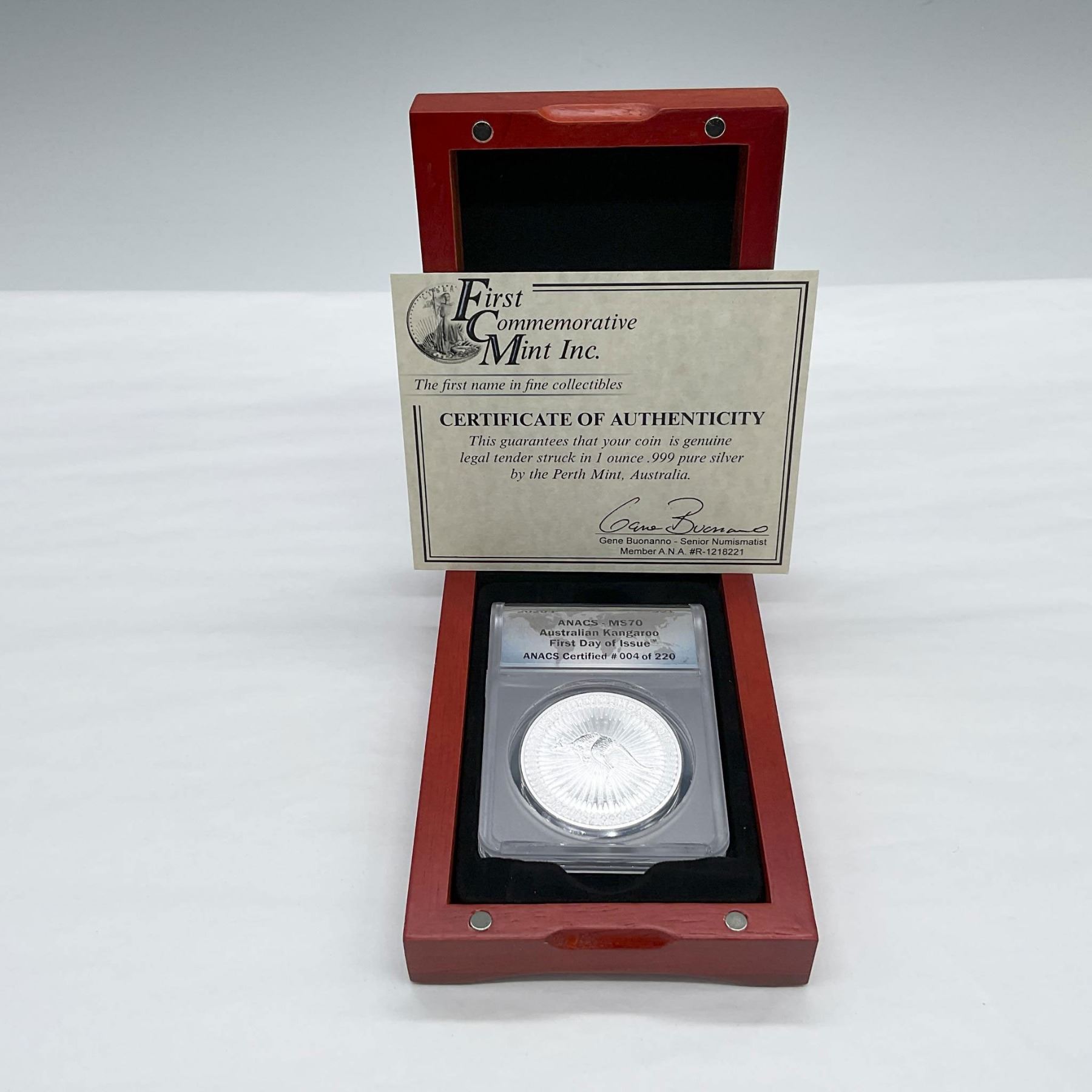 Slabbed MS70. First Day Of Issue. Certified number 4 of 220. Perth Mint. The obverse side depicts the sixth-generation effigy of Queen Elizabeth II. The reverse features the famous image of the kangaroo from the Australian copper penny coinage. The coin is in a protective case. The case is approximately: 2.25"L x 0.5"W x 3.25"H. This item has its original box: 5"L x 3.5"W x 1.5"H.