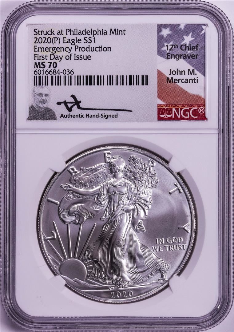 2020(P) Philadelphia $1 American Silver Eagle Coin NGC MS70 Mercanti Signed FDOI
