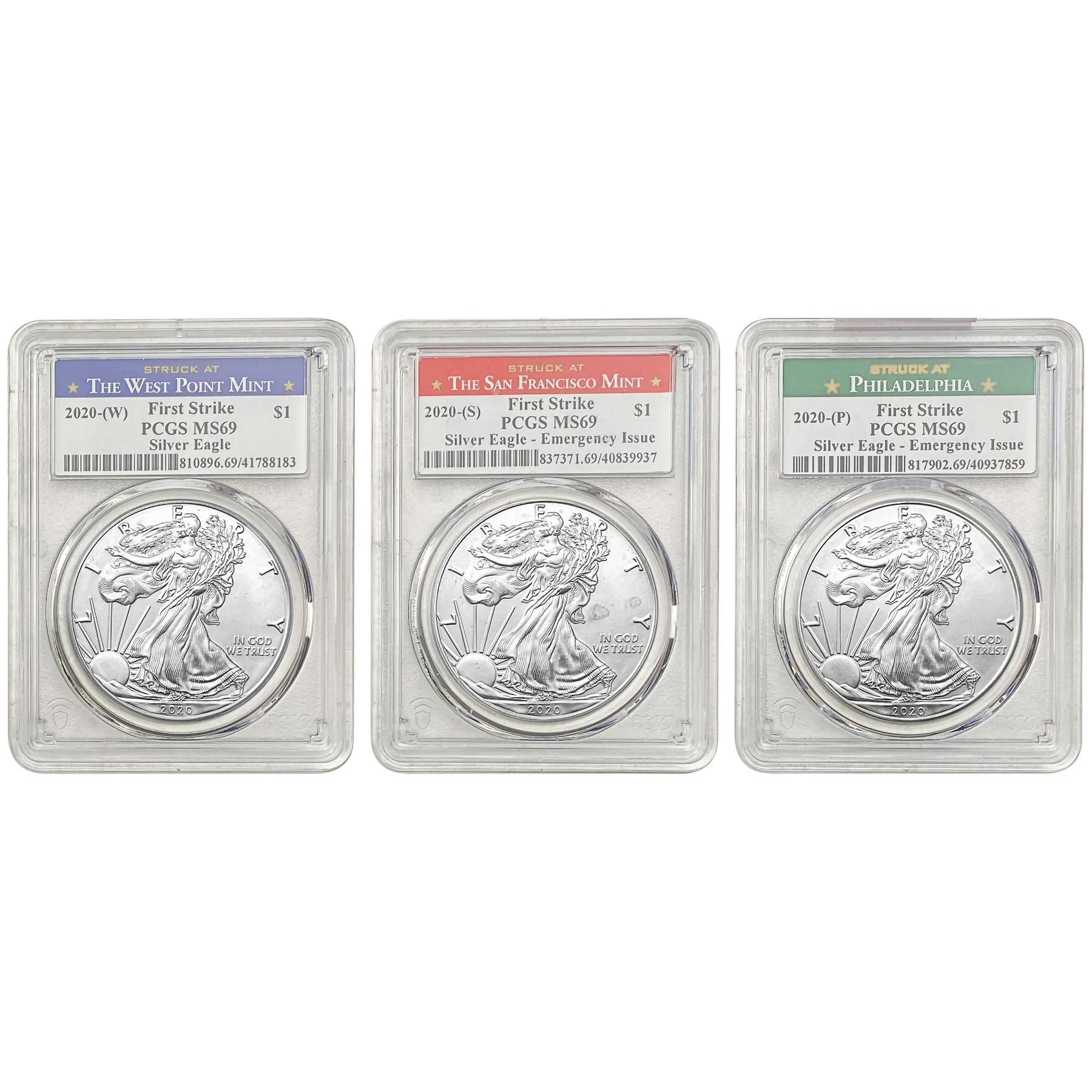2020 P,W,S Silver Eagle Set [3 Coins] PCGS MS69