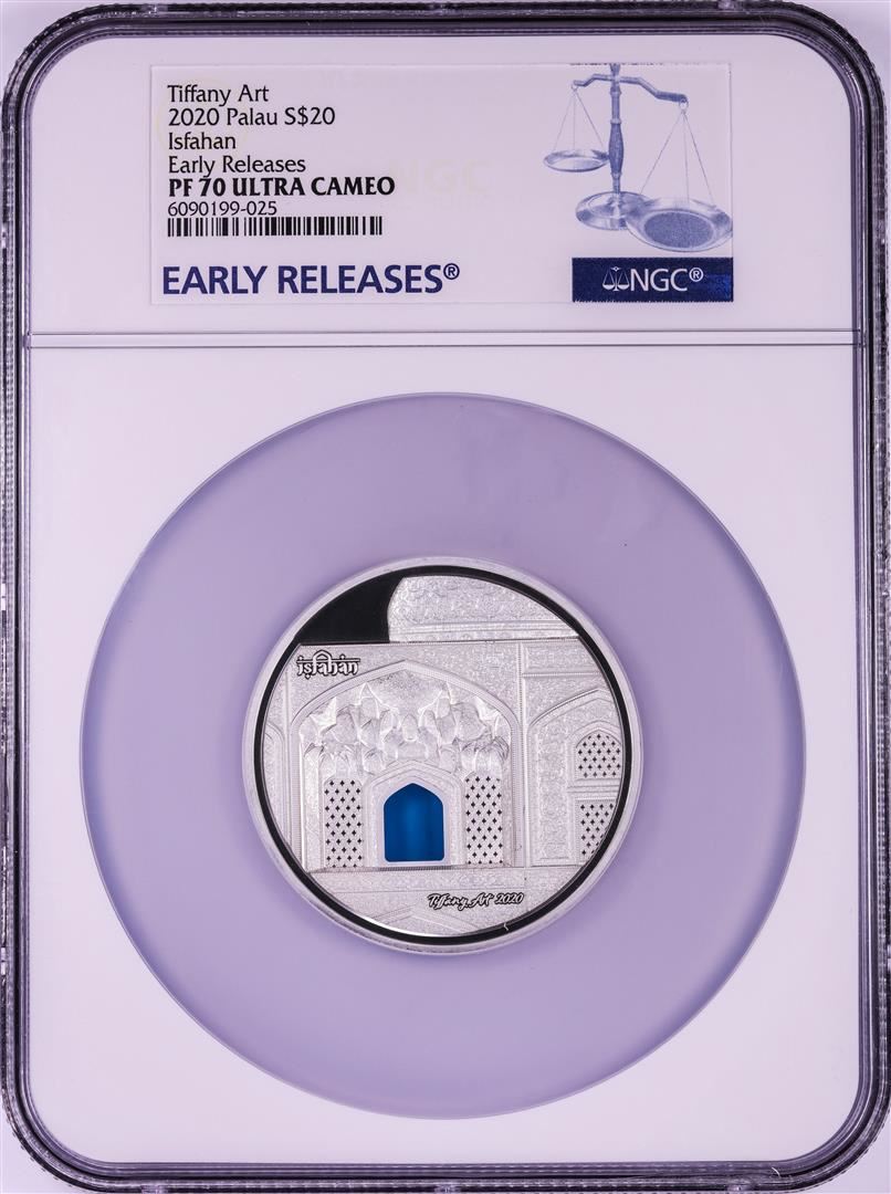 One 2020 Palau $20 Proof Tiffany Art Isfahan Silver Coin NGC PF70 Ultra Cameo ER. NGC Certified.